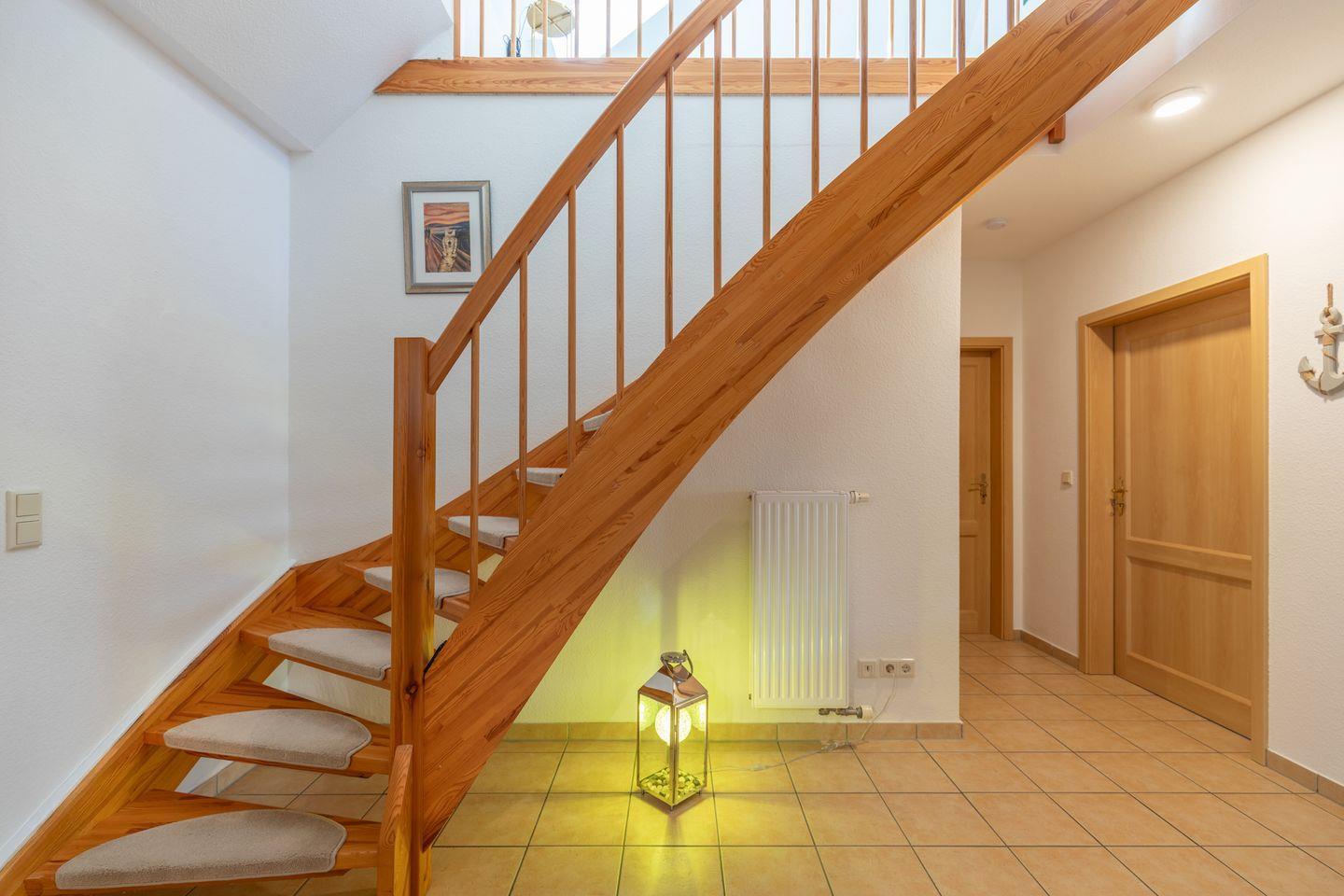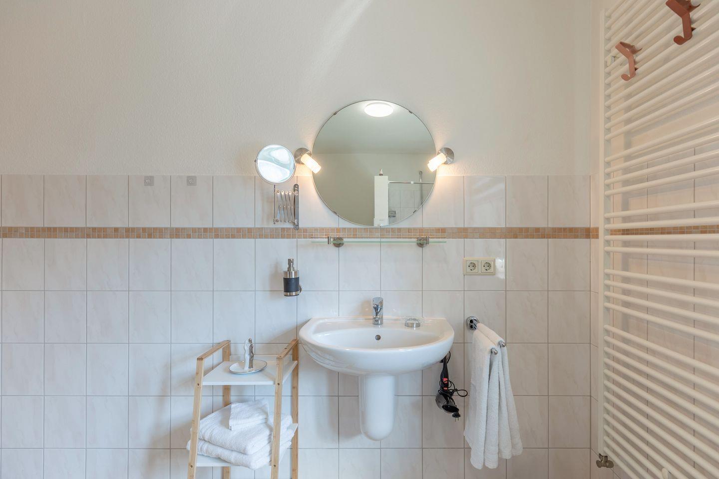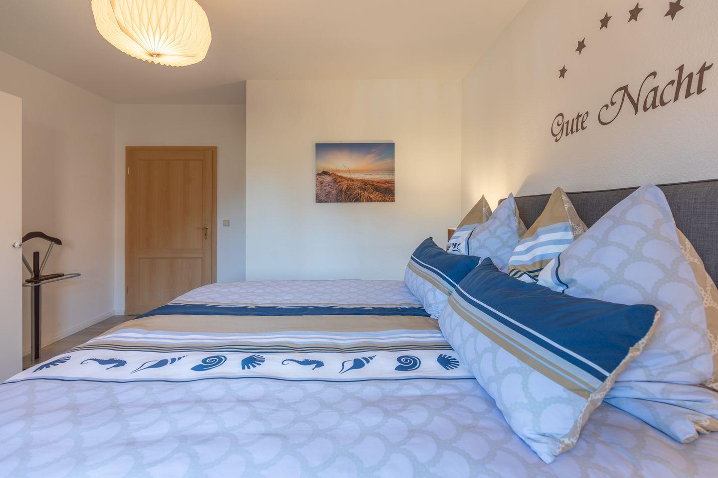 Im Erdgeschoss befindet sich das erste von zwei Schlafzimmern im Haus. Der Raum ist in hellen, ruhigen Farben gehalten und mit einem großen Doppelbett (200 x 200?cm) ausgestattet. Ein Kleiderschrank mit Spiegelfront bietet zudem ausreichend Stauraum für Ihre Kleidung. Das Badezimmer ist großzügig geschnitten und mit einer ebenerdigen Dusche sowie einem Waschbecken mit Spiegel, ein Kosmetikspiegel sowie ein Handtuchheizkörper ausgestattet.