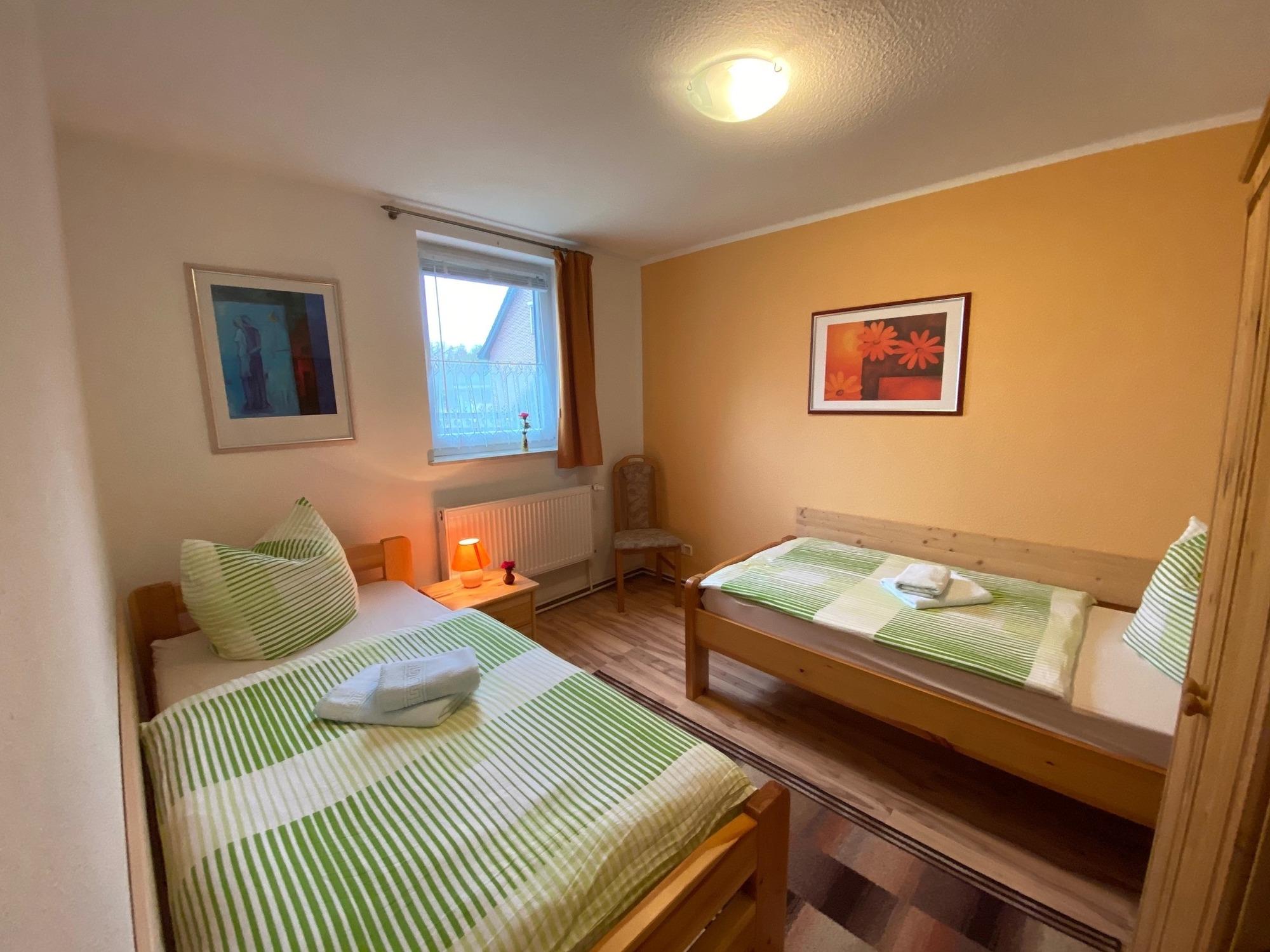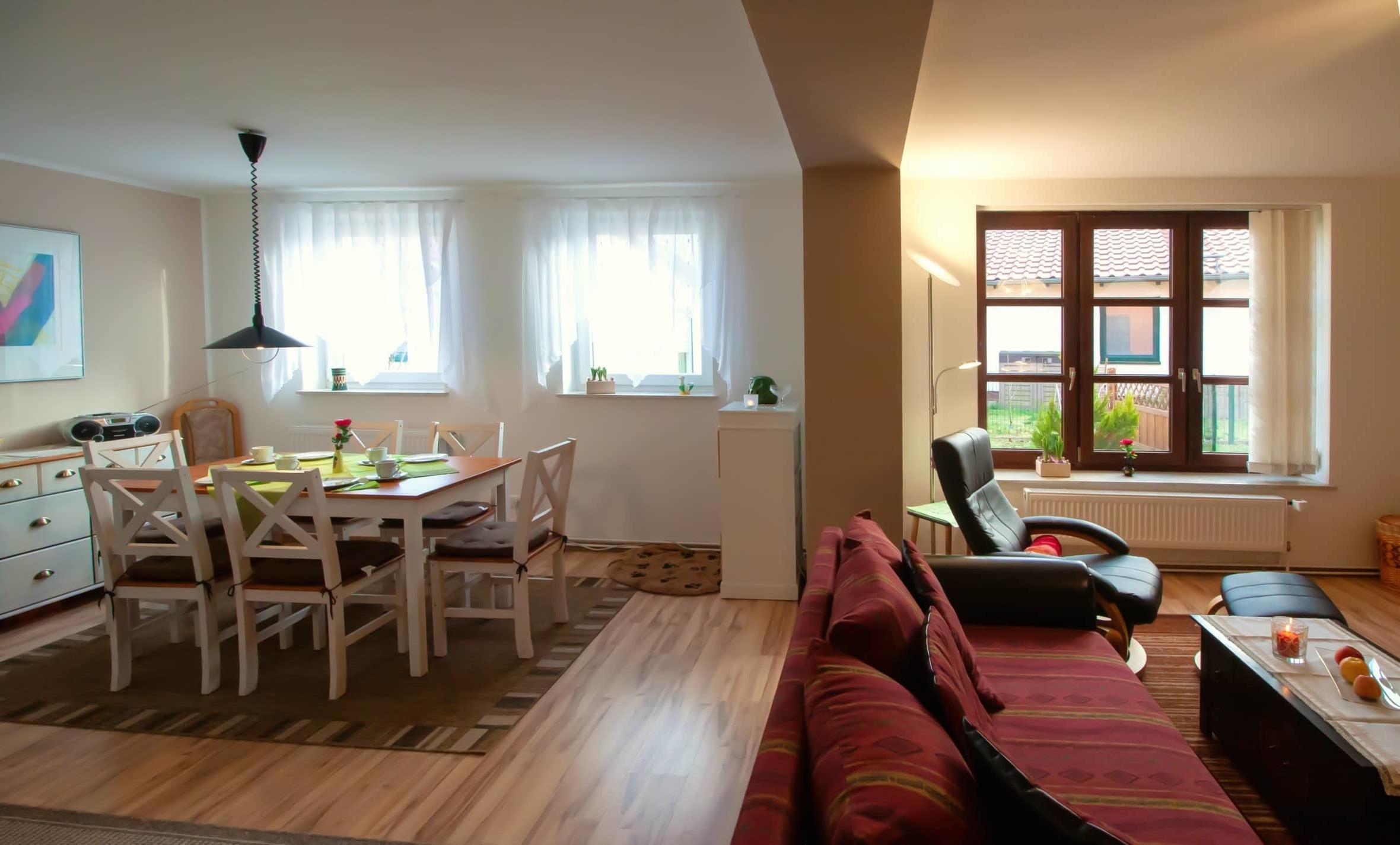 Unsere großzügige Ferienwohnung bietet auf einer Ebene reichlich Platz für 5 Personen. Auf ca. 75m² finden Sie ein großes Wohnzimmer mit Küche, zwei Schlafzimmer (gut für Schnarcher) und Familien sowie das helle Bad mit Dusche. ...