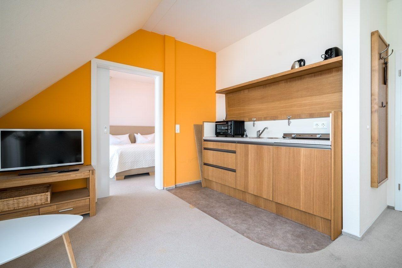 Die helle Küchenzeile ist mit einem Elektro-/Gasherd, Backofen, Kühlschrank, Kaffeemaschine und einem Toaster ausgestattet. Ein Esstisch lädt zu gemeinsamen Mahlzeiten ein. Im großzügigen Wohnbereich stehen ein Sofa, Sessel und eine HiFi-Anlage zur Verfügung.