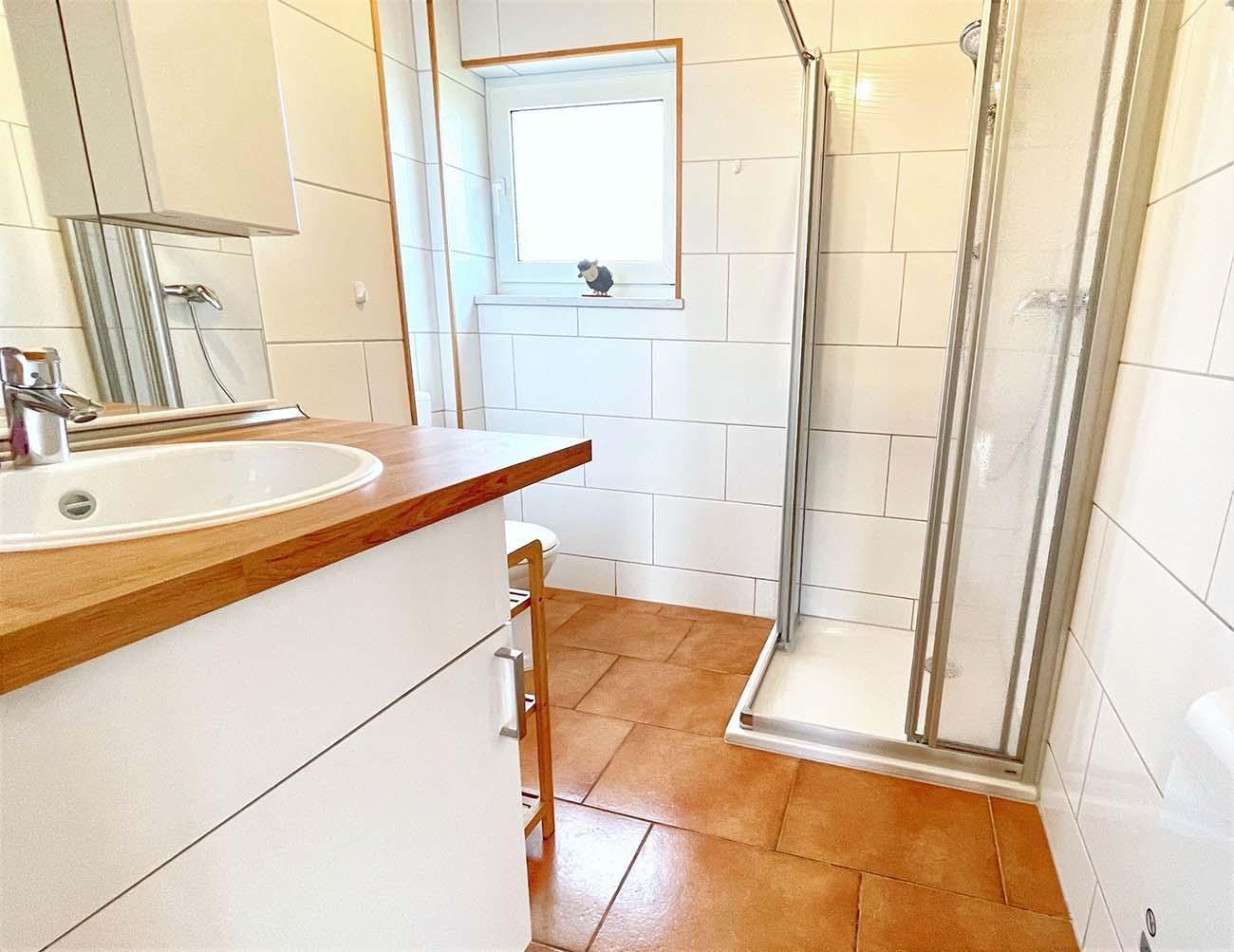 Die Schlafräume ausgestattet mit Doppelbett bzw. zwei Einzelbetten, das Bad mit Dusche, sowie die vollausgestattete Einbauküche komplettieren das Ferienhaus „Möwe“.