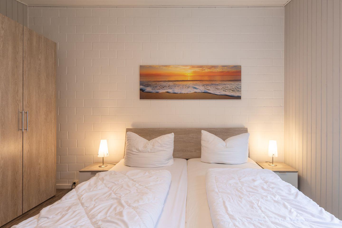 Die Doppelhaushälfte bietet Platz für bis zu 4 Personen auf einer Etage mit 2 Schlafzimmern, offenem Wohn- und Essbereich, Küchenzeile, Terrasse und Abstellraum.