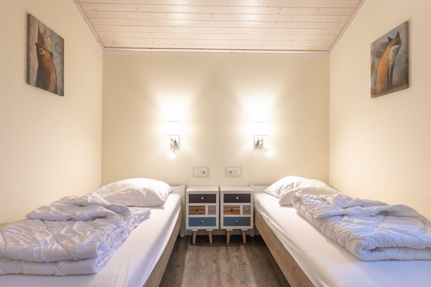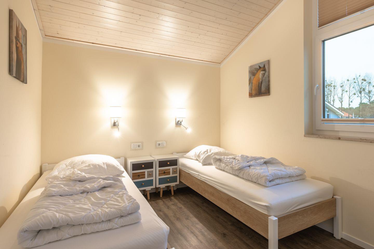 Das Ferienhaus im skandinavischen Stil bietet Platz für bis zu 4 Personen auf einer Etage mit 2 Schlafzimmern, Wohn-/Essbereich, Einbauküche, Badezimmer mit Sauna und Whirlpool, Terrasse und Pkw-Stellplatz.