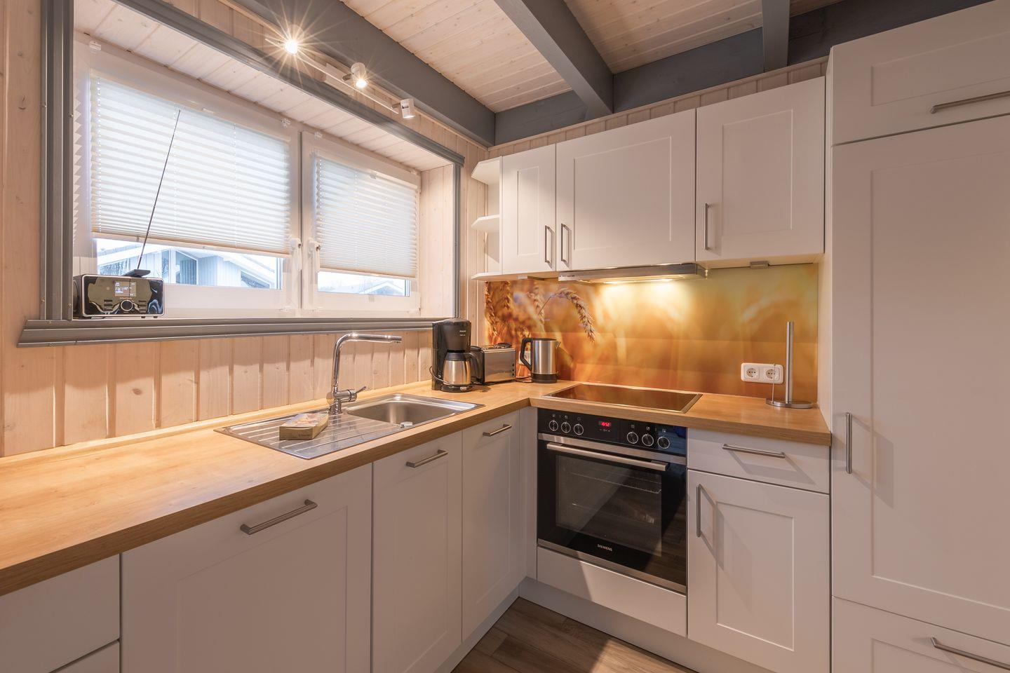 Das Ferienhaus im skandinavischen Stil bietet Platz für bis zu 6 Personen auf 2 Etagen mit 2 Schlafzimmern und offener Schlafgalerie, großen Wohn-/Essbereich, Einbauküche, Bad mit Sauna und Whirlpool, Pkw-Stellplatz und Terrasse.