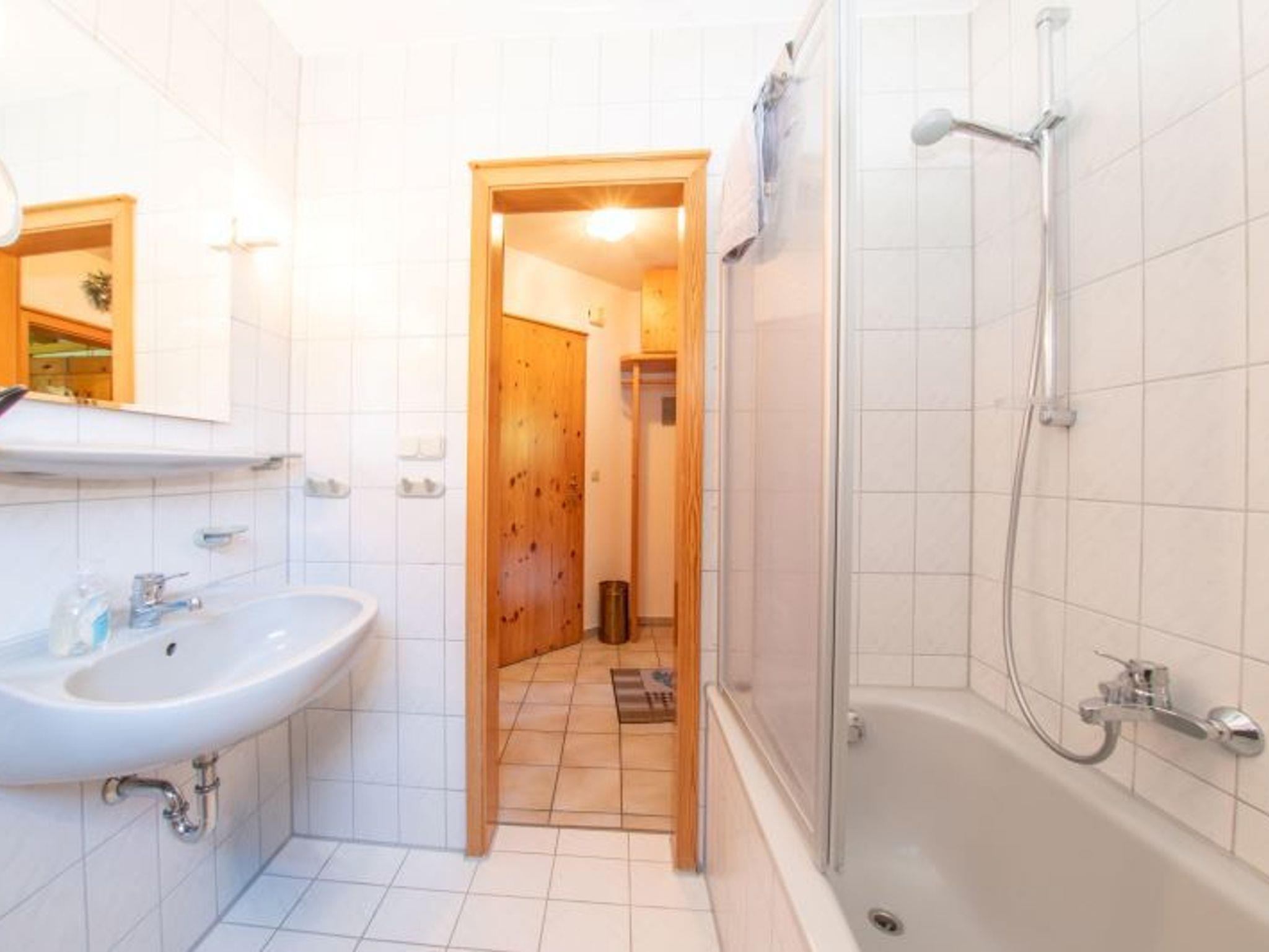 Das Schlafzimmer ist mit einem Doppelbett eingerichtet, ein Tresor ist im Kleiderschrank integriert. Das Badezimmer ist raumhoch gefliest und verfügt über eine Badewanne mit Duschabtrennung.