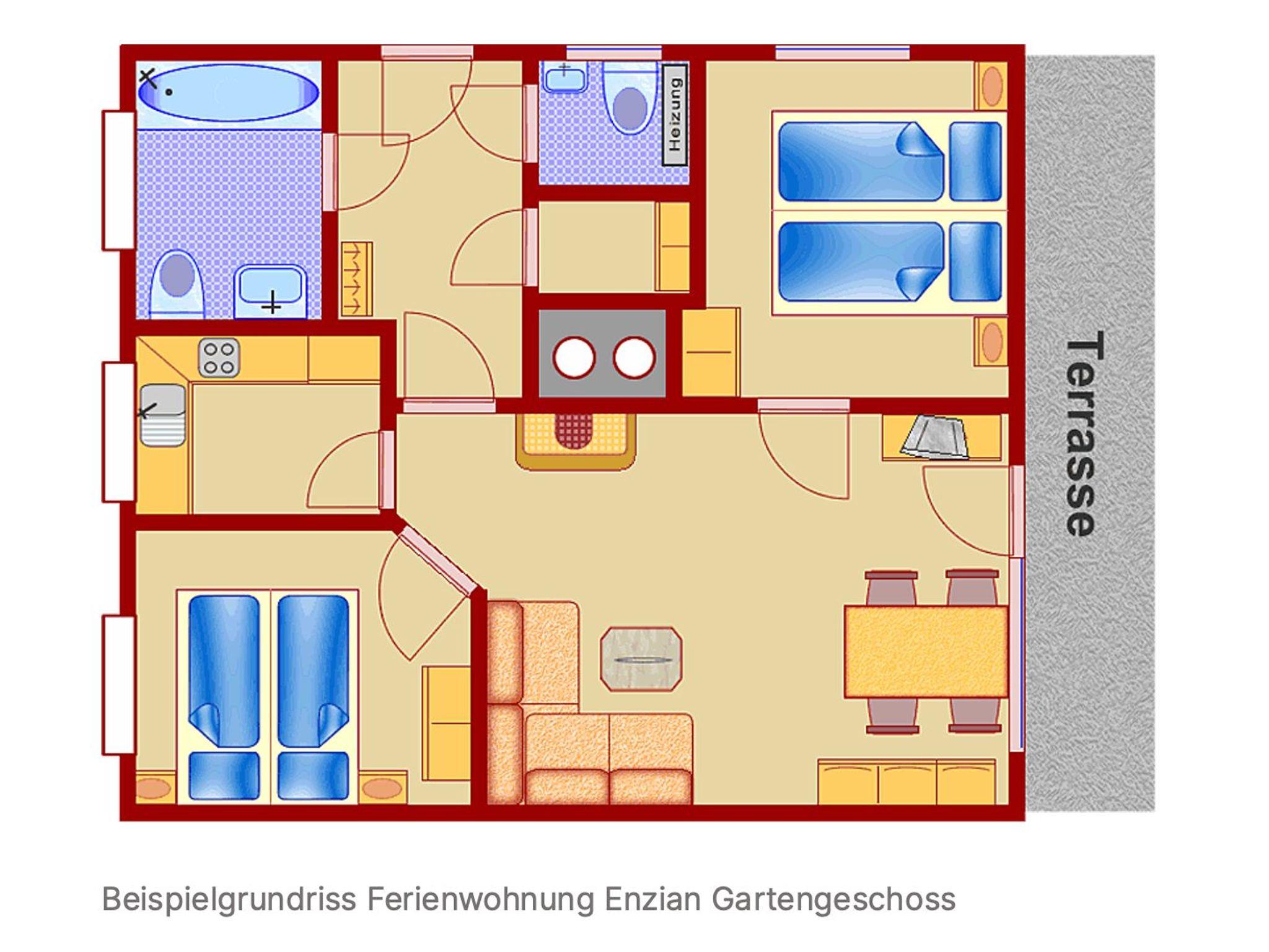 Die Ferienwohnung Enzian im Gartengeschoss ist besonders für Familien mit Kindern geeignet, da ein direkter Zugang zum Garten vorhanden ist.