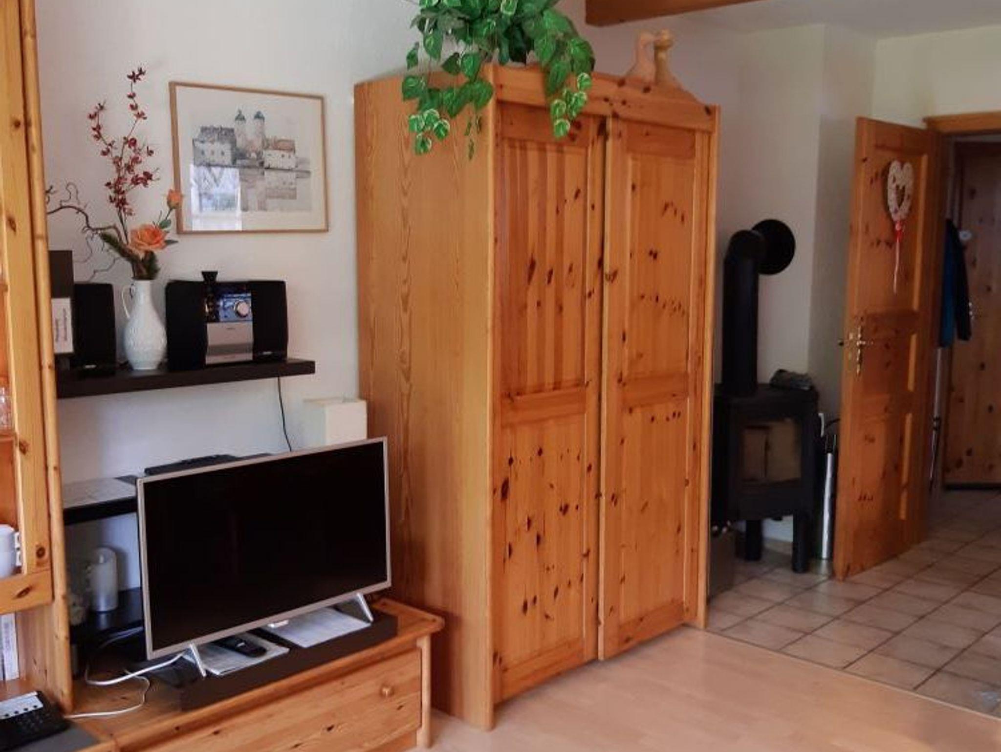 Der Wohnbereich verfügt über eine Sitz- und Essecke sowie eine hochwertige, ausziehbare Schlafcouch für zwei Personen. Zur weiteren Ausstattung gehören ein Flachbildfernseher mit Kabelanschluss und Radiofunktion, kostenloses WLAN, eine Stereoanlage mit Kassette, CD und Radio, ein Telefon, ein Vitrinenschrank, zusätzlicher Kleiderschrank, ein Kaminofen sowie Gesellschaftsspiele, Bücher und eine Wanderkarte.