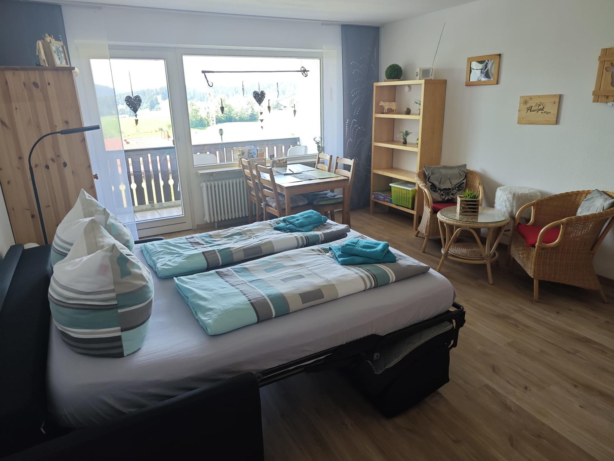 Schönes 2 Zimmer Appartement 45m² im Ferienpark Oberallgäu in Wilhams für 4 Personen im Erdgeschoss mit Balkon. Das Hallenschwimmbad (14x8 m) ist täglich von 09:00-22:00 Uhr geöffnet, die Sauna kann täglich von 16:00-22:00 Uhr (kostenpflichtig) genutzt werden. Spielplätze, Wanderwege, Badeseen in der Nähe. Schöner Ausblick zur Skipiste und Skiloipe.