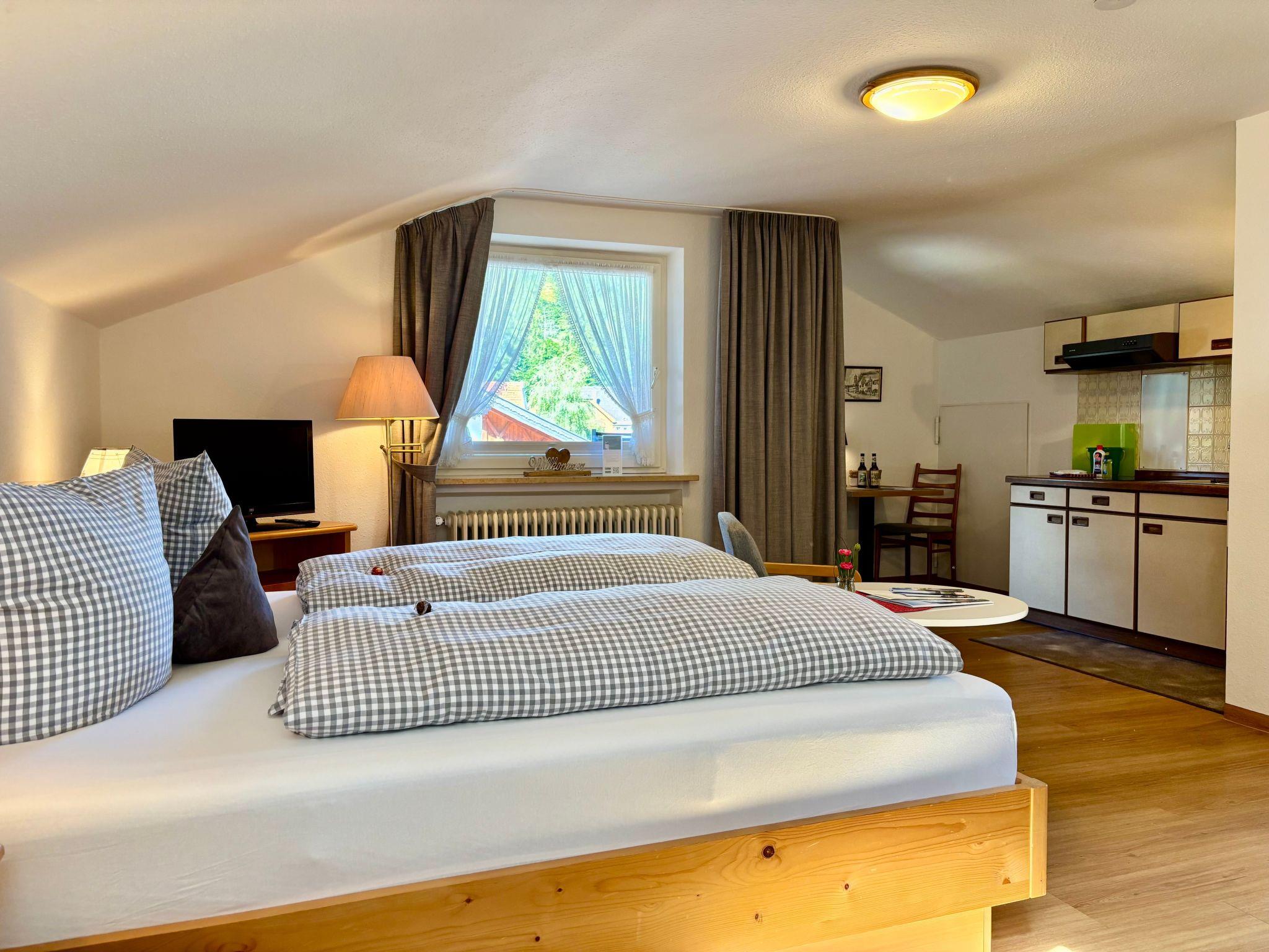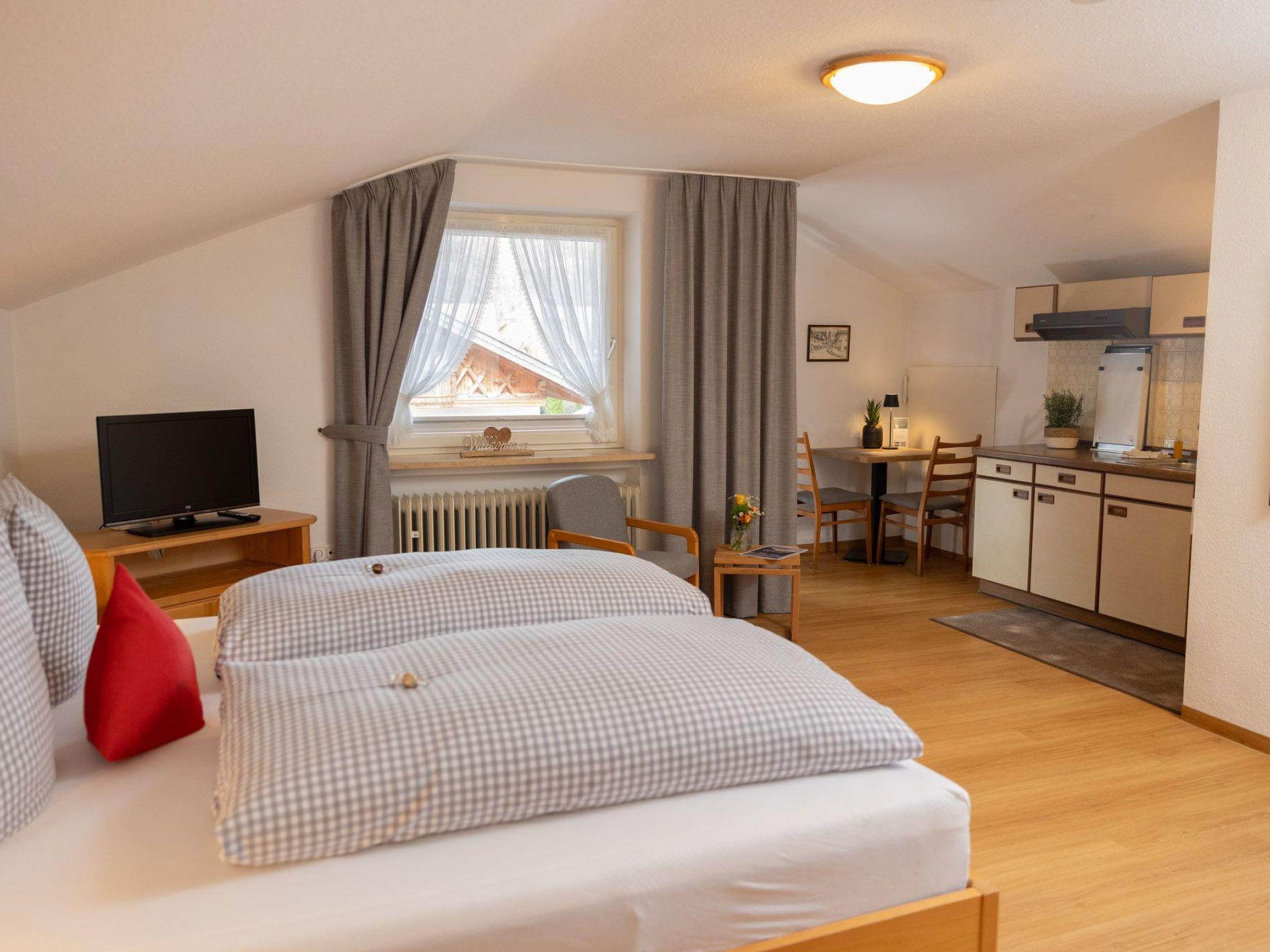 The flat is located on the 2nd floor of our family-run house and is lovingly furnished: a comfortable double bed, a well-equipped kitchenette (2-plate ceramic hob, coffee machine, toaster, kettle) with adjoining dining area, a bright living area with couch, seating area, satellite TV & WLAN as well as a bathroom with shower, WC and hairdryer. Bed linen, towels, tea towels, electricity, water, heating, final cleaning, car parking space at the house and secure storage for bicycles are included.