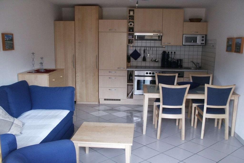 Komfortabel ferielejlighed på cirka 44 kvm i Mittenwald med separate soveværelser, ideel til to gæster. Der er brusebad med toilet. Køkkenet er udstyret med køleskab/fryser, 4-brænder keramisk kogeplade med ovn og mikrobølgeovn samt opvaskemaskine. Satellit-tv og Wi-Fi er også tilgængelige. Haven er til jeres eksklusive brug.