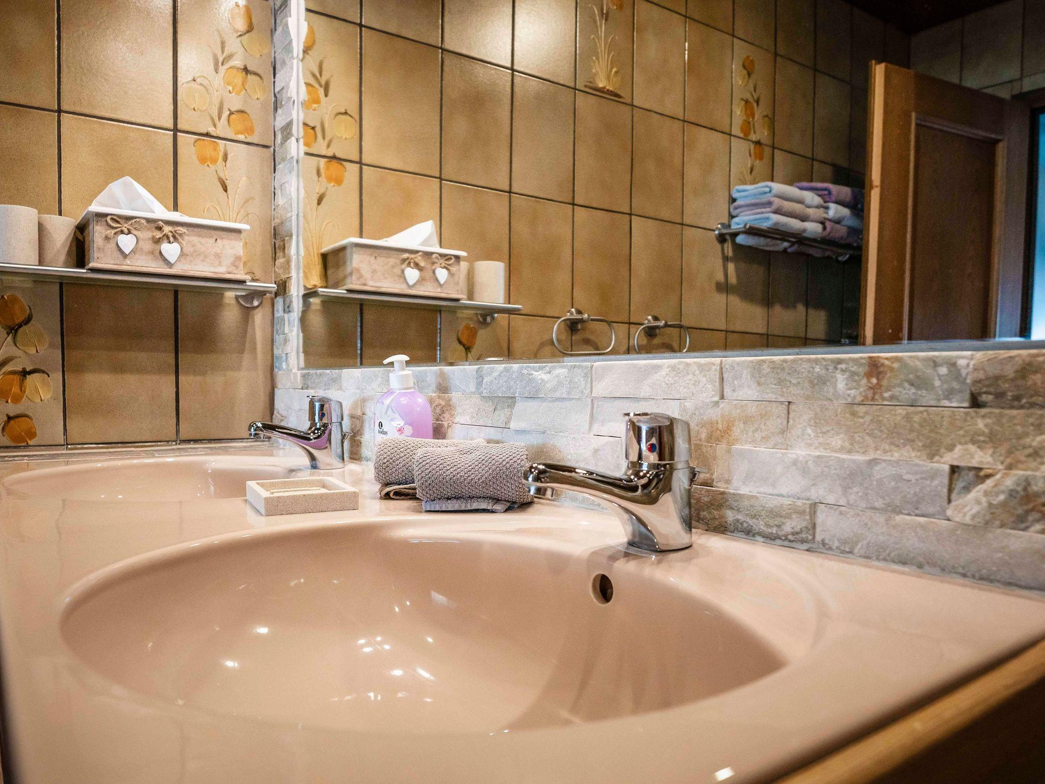Das Badezimmer der Ferienwohnung Linderspitzblick ist geräumig und verfügt über eine Badewanne sowie zwei Waschbecken. Hier können die Gäste sich nach einem langen Tag in den Bergen erfrischen und entspannen. Handtücher werden gestellt. In der Wohnung befindet sich auch ein zusätzliches Gäste-WC. Im Bad steht eine Waschmaschine mit Trocknerfunktion kostenfrei zur Verfügung.
