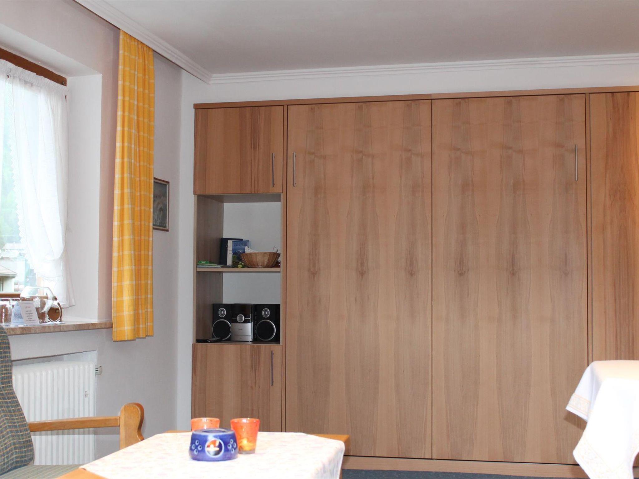 Genießen Sie den herrlichen Bergblick auf unser wunderschönes Wettersteingebirge und den Kranzberg vom West-Balkon Ihrer gemütlichen Ferienwohnung mit >40m². Wohn-Schlafzimmer mit Schrankbetten (normale Betten, tagsüber im Schrank, brauchen abends nur ausgeklappt werden), bequeme Sitzgruppe und Essecke, SAT-TV, Radio, Telefon; sep. Einzelschlafzimmer sep. Küche mit Kochplatten, Mikrowelle auf Wunsch, Kühlschrank mit Gefrierfach, Kaffeemaschine, Wasserkocher und kompl. Geschirr; Dusche/ WC, Fön; Balkon mit Sonnenschirm und Gartenmöbeln; Bettwäsche, Handtücher, Tischdecken und Geschirrtücher vorhanden