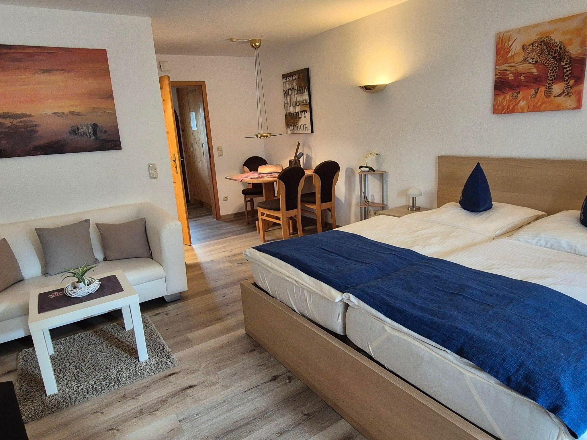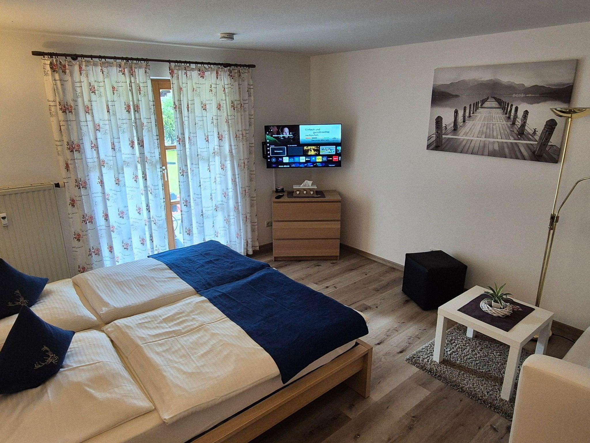 Das Fernsehen ist sowohl vom Bett aus, wie auch von der Couchecke und auch aus der Essecke (Tisch mit 3 Stühlen) möglich...