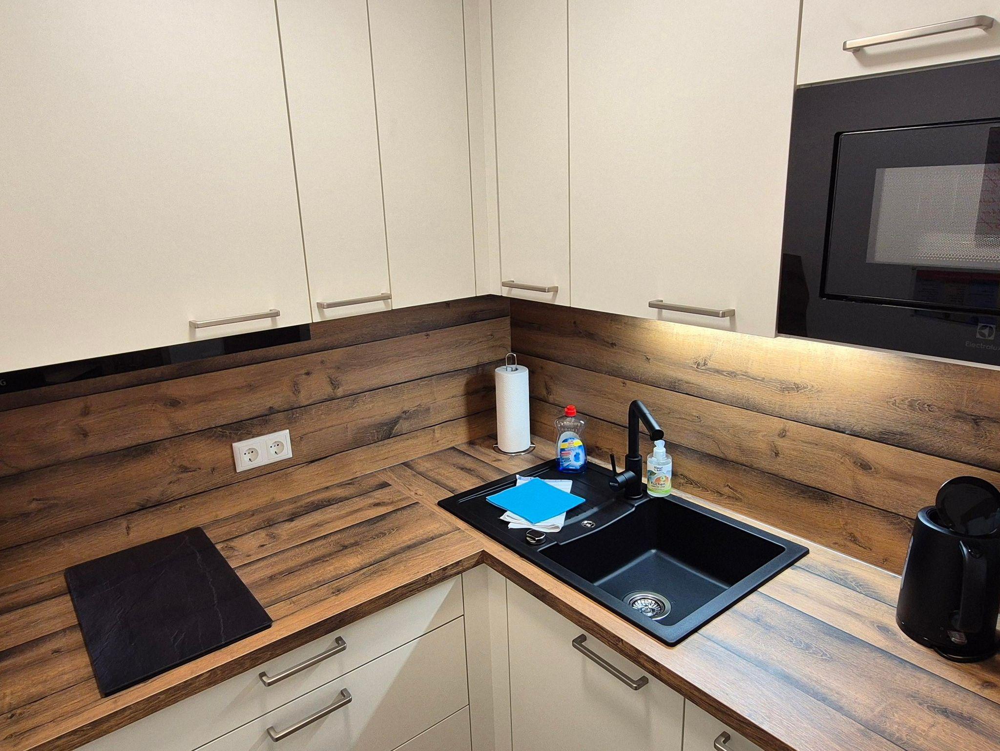 Die kleine Küche ist voll ausgestattet und bietet neben Kaffeemaschine, Wasserkocher, Eierkocher und Kühlschrank (inkl. TK - Fach) auch einen Herd (4 Platten Ceranfeld) inkl. Backofen. Selbstverständlich sind Töpfe, Pfannen, Geschirr und Besteck ausreichend vorhanden.