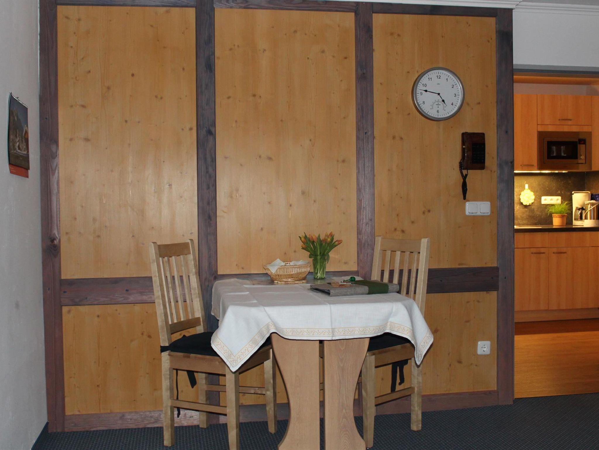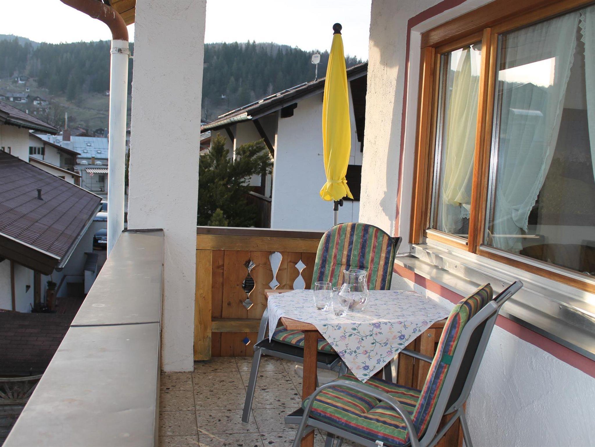 Genießen Sie den herrlichen Bergblick auf unser wunderschönes Karwendel- und Wettersteingebirge von dem Südbalkon Ihrer gemütlichen Ferienwohnung mit 28m² bis 30m². Wohn-Schlafzimmer mit Schrankbetten (normale Betten, tagsüber im Schrank, brauchen abends nur ausgeklappt werden), bequeme Sitzgruppe und Essecke, SAT-TV, Radio, Telefon; sep. Küche mit Kochplatten, Mikrowelle auf Wunsch, Kühlschrank mit Gefrierfach, Kaffeemaschine, Wasserkocher und kompl. Geschirr; Dusche/ WC, Fön; Balkon mit Sonnenschirm und Gartenmöbeln; Bettwäsche, Handtücher, Tischdecken und Geschirrtücher vorhanden
