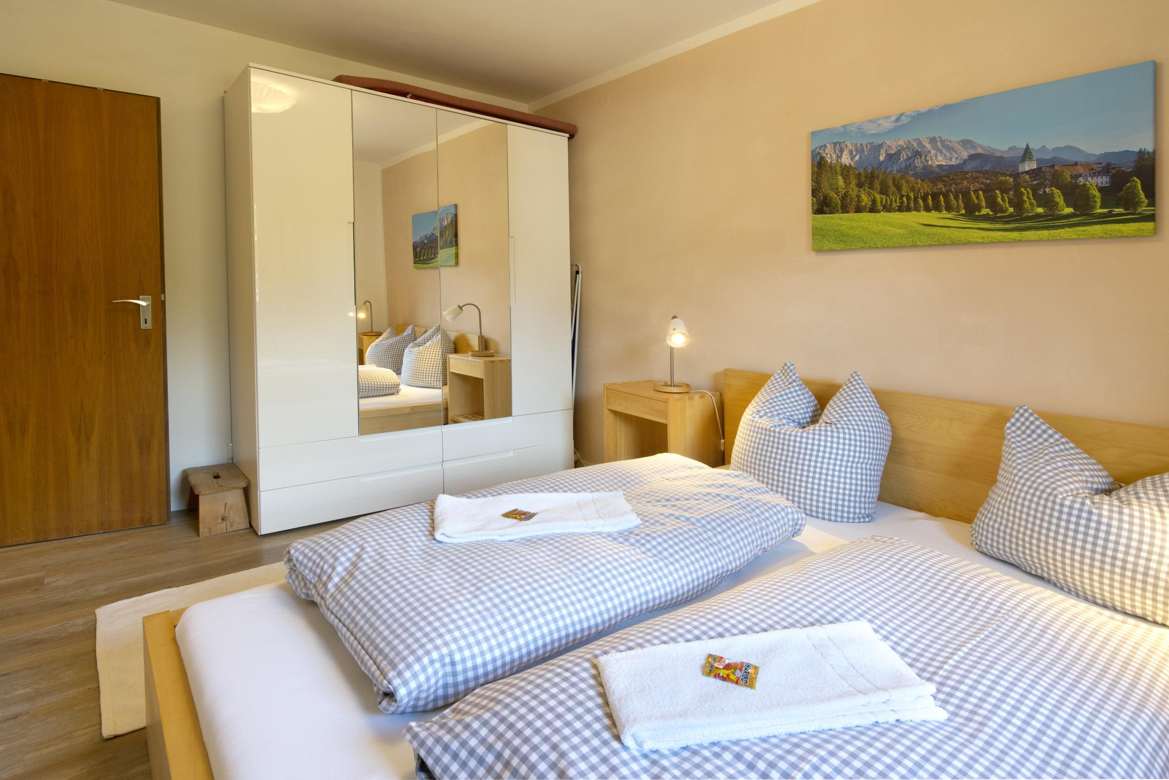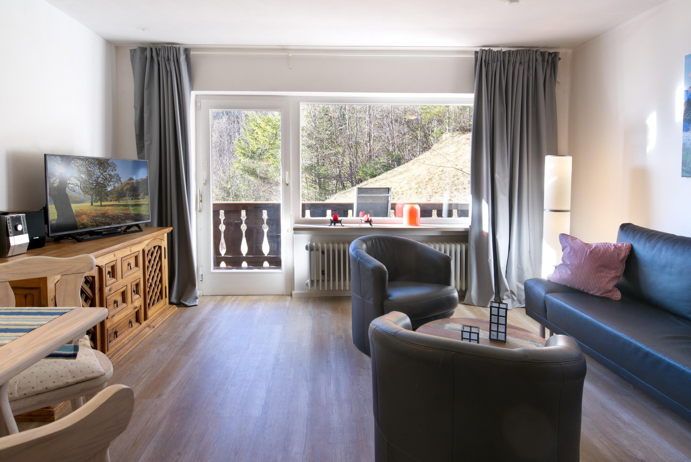 Die gemütliche 2 Zimmer-Wohnung (45qm) im 1. Stock hat einen rückseitig gelegenen Balkon, der seitlich einen Blick zum Karwendelgebirge ermöglicht. Wer das Besondere und die Abgeschiedenheit sucht, der ist hier richtig.