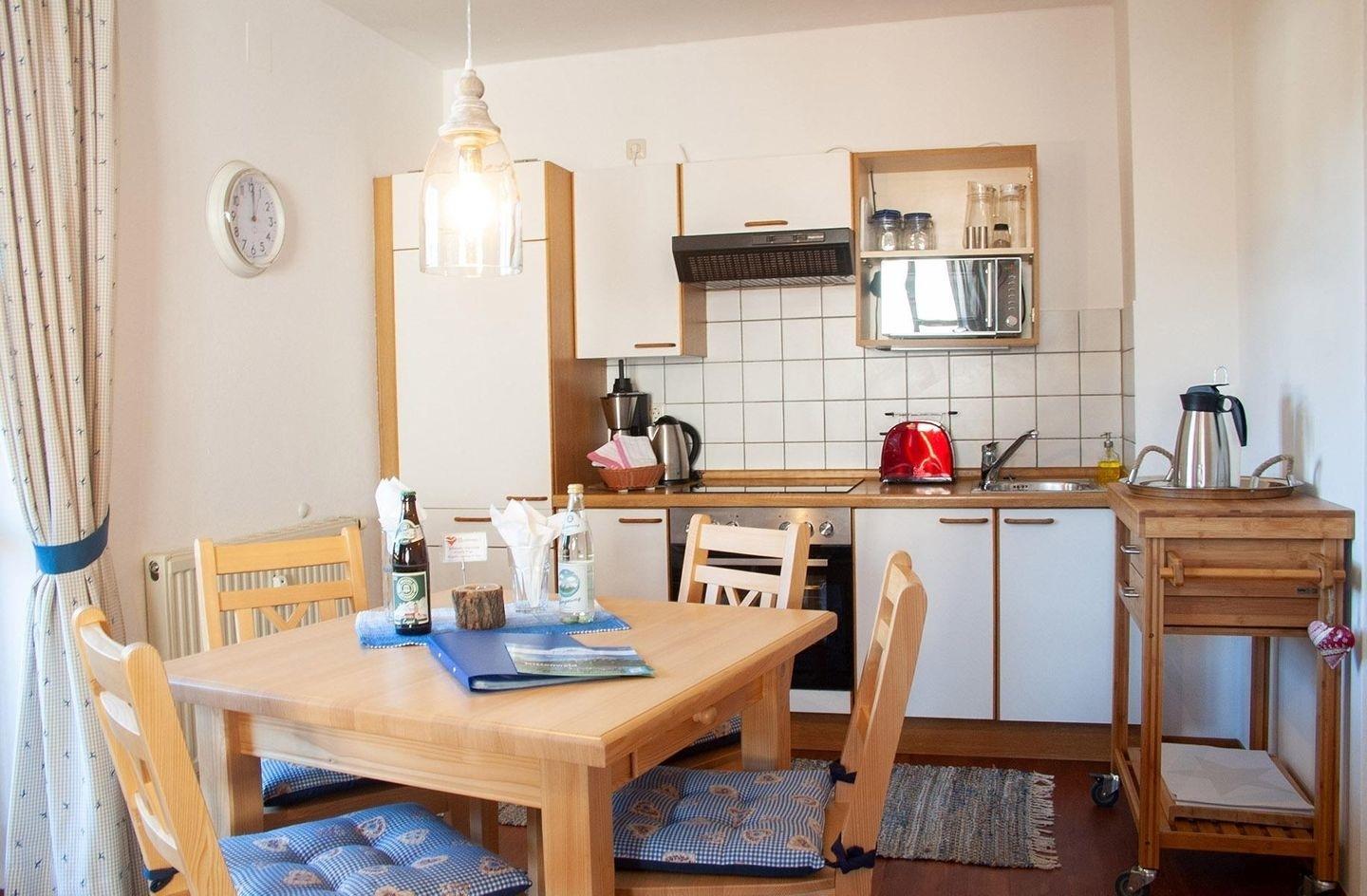 Küchenzeile (Geschirrspüle, Mikrowelle etc.) Essgruppe und Couchgruppe (Couch ausziehbar).