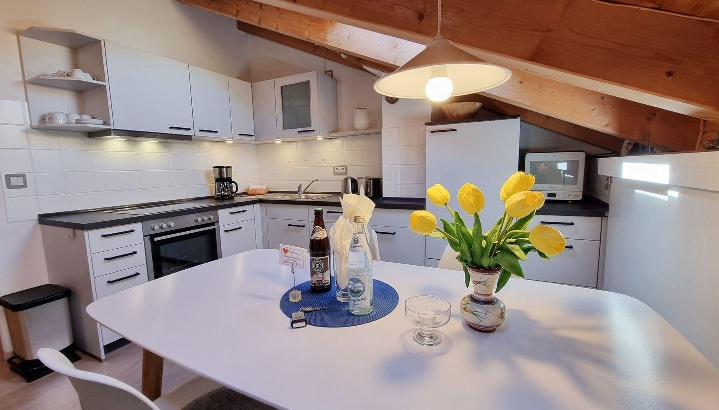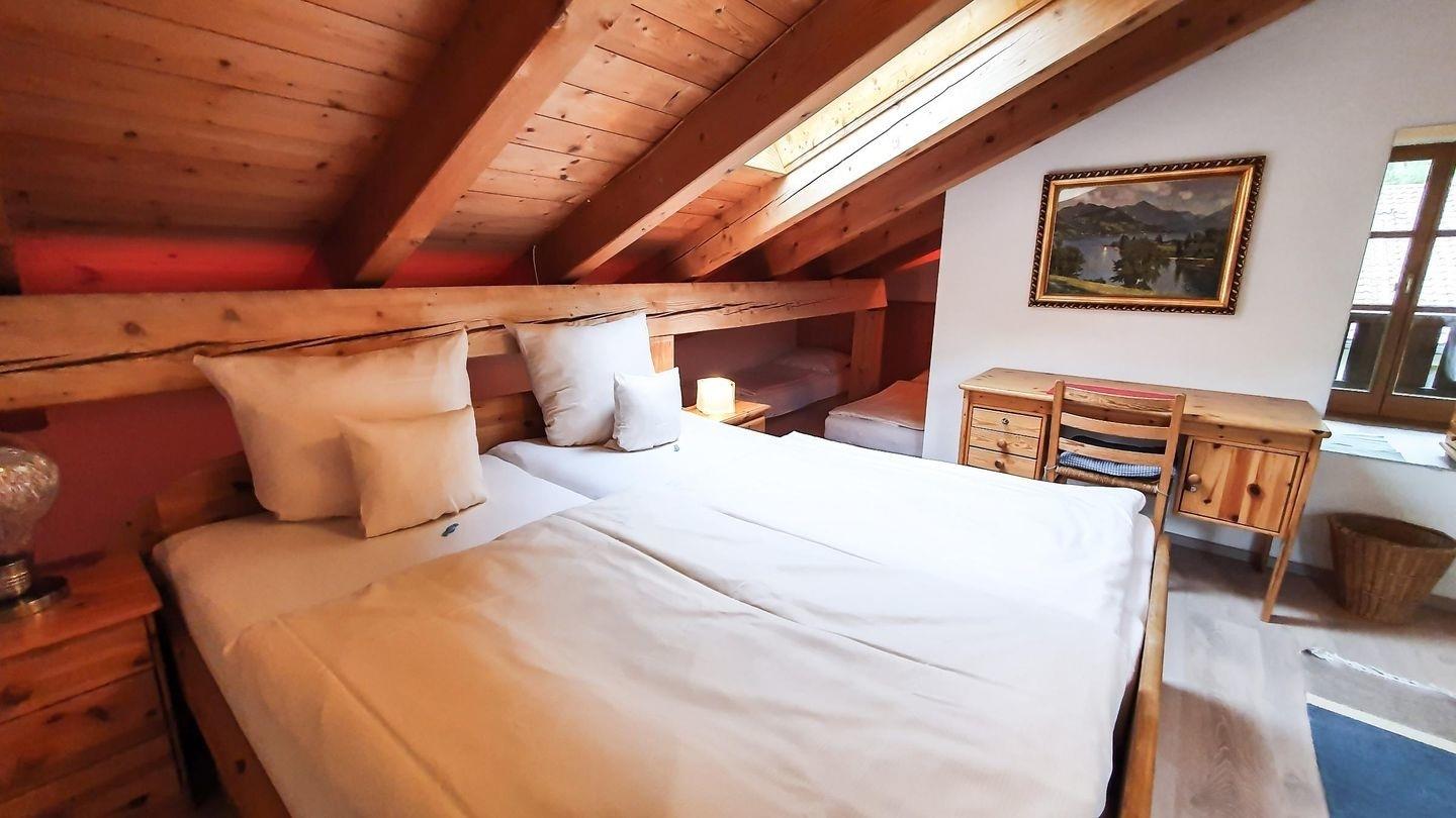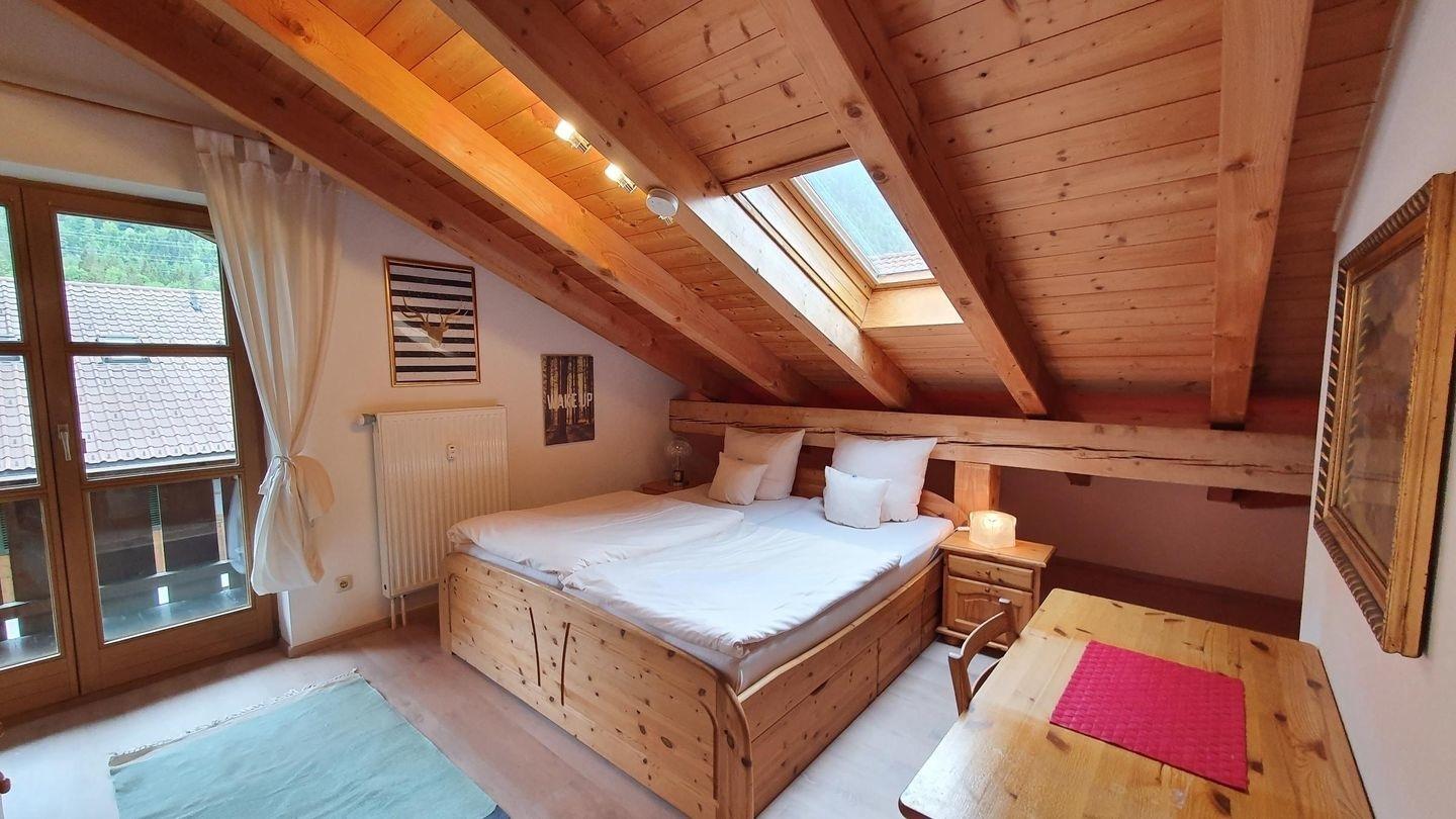 Im alpenländischen Stil gestaltete 2 Zimmer- Dachgeschosswohnung (62qm) mit sichtbarem Dachstuhl, belegbar mit max. 4 Personen, davon schlafen zwei in der Nische unter der Dachschräge.