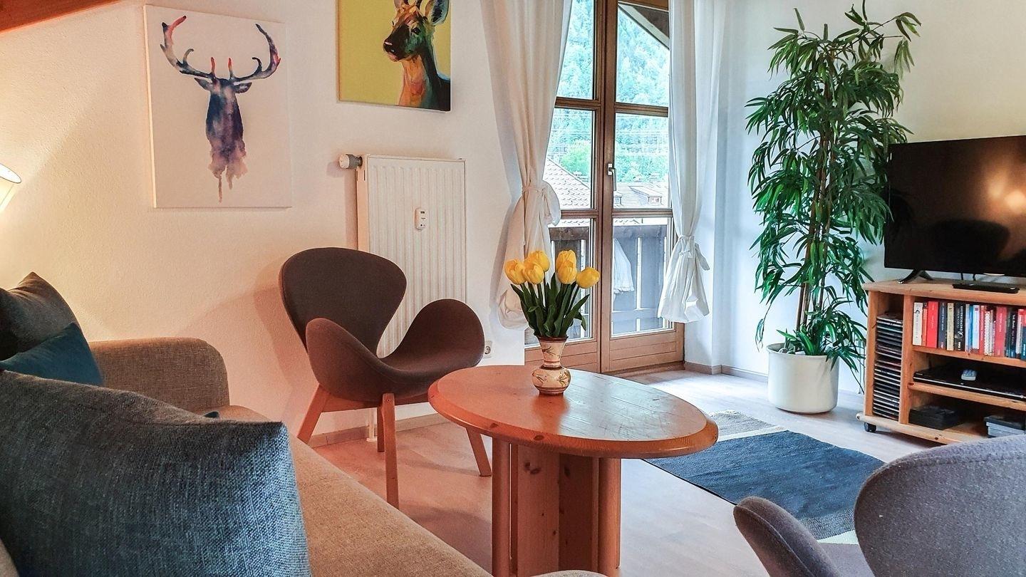 Die im alpenländischen Stil eingerichtete 2-Zimmerwohnung "Timo" ***, bietet mit einem Ostbalkon und sichtbaren Dachstuhl besondere Elemente. Sie ist geschmackvoll im alpenländischen Stil eingerichtet.