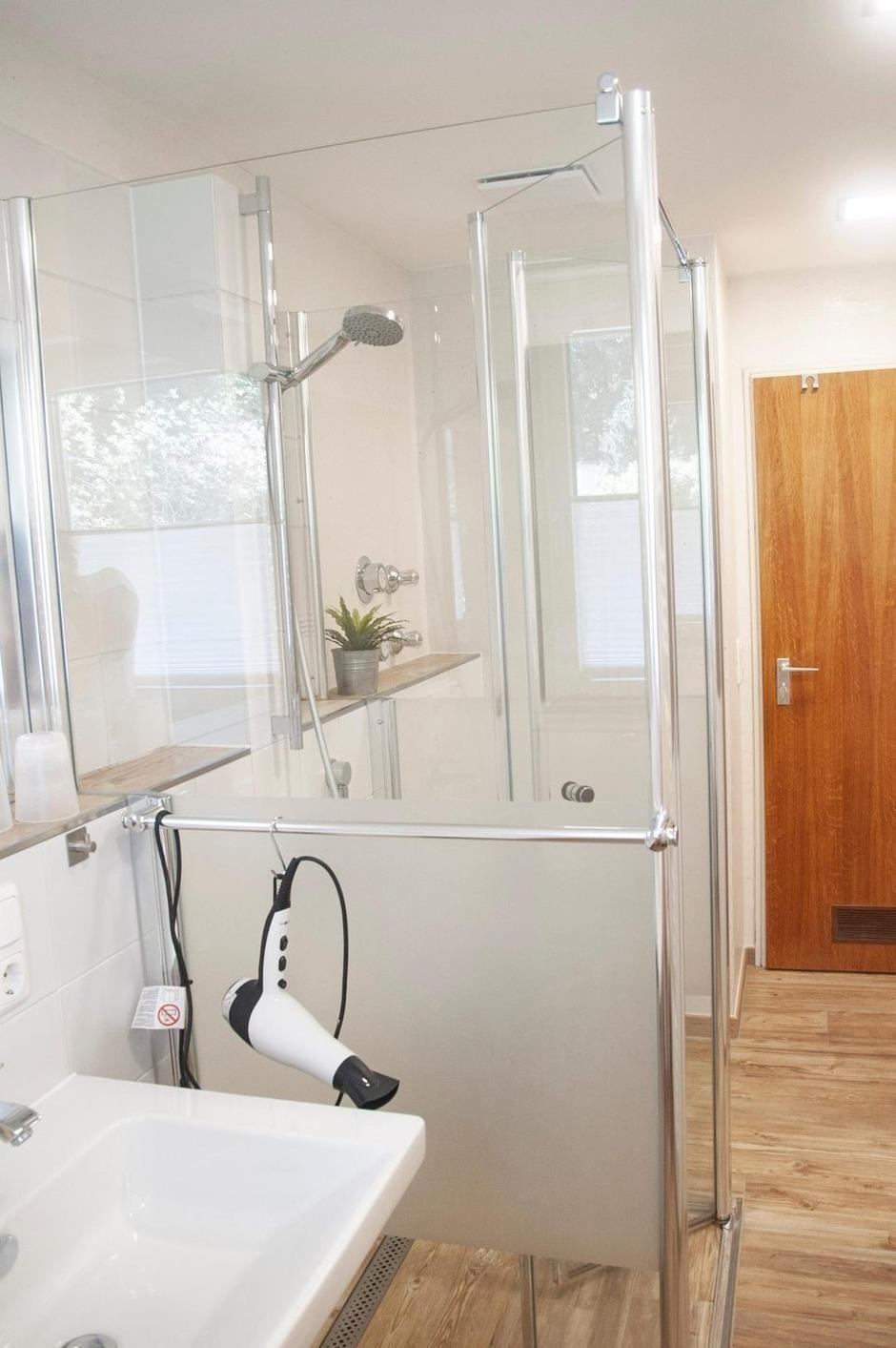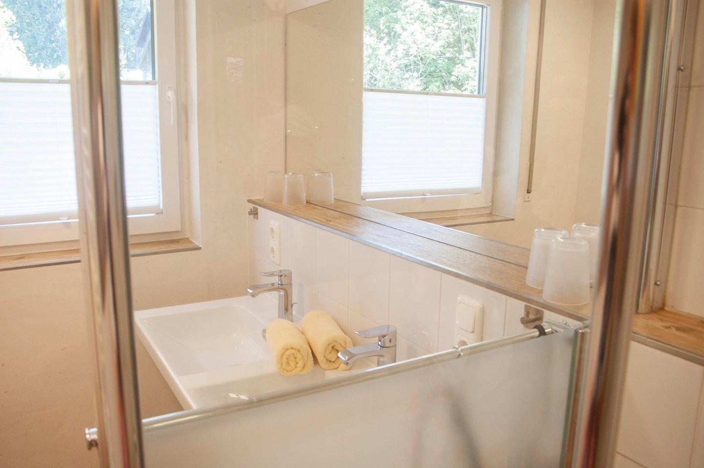 Das Bad mit Dusche, Doppelwaschbecken und Toilette ist geräumig geschnitten. Eine weitere separate Toilette mit kleinem Waschbecken ist ein weiterer Vorteil.