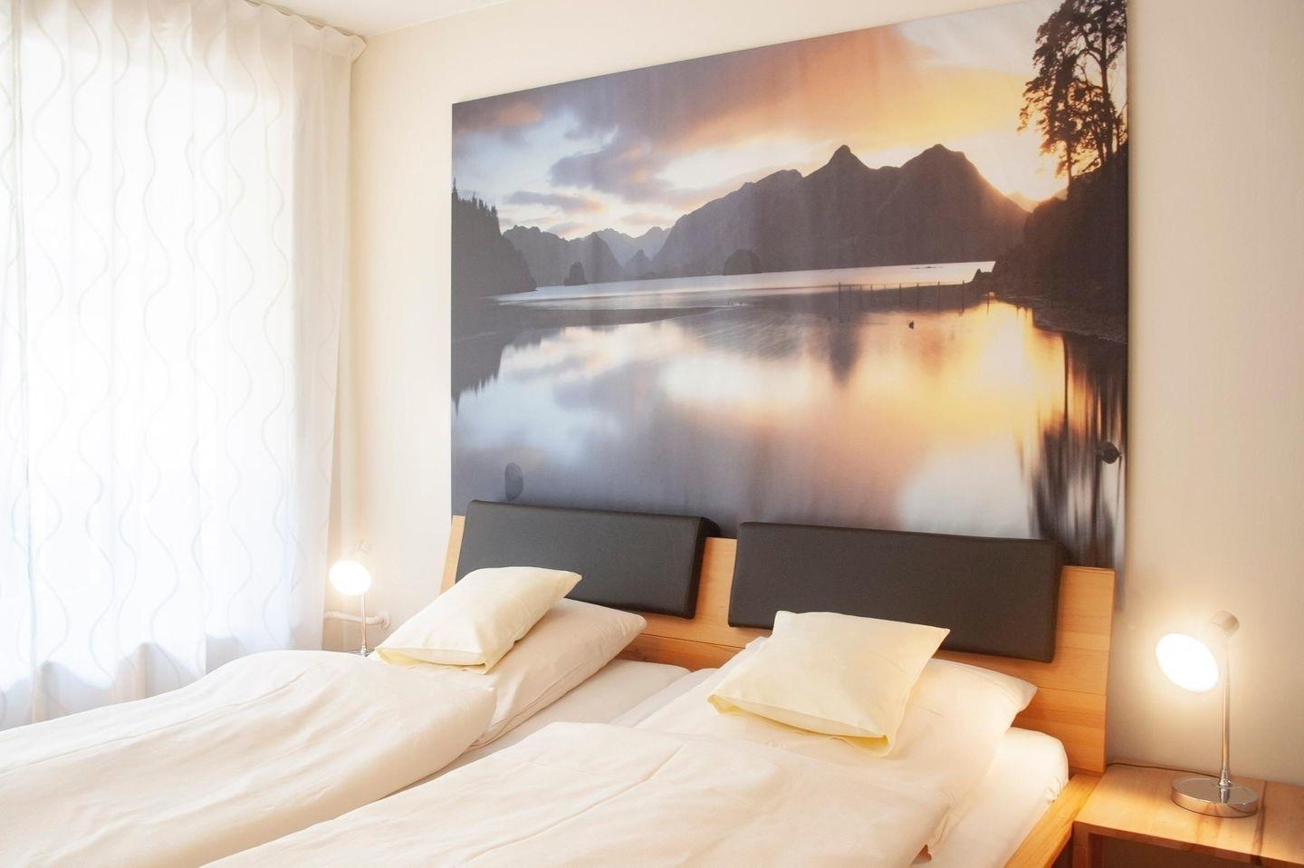 Das nach Osten gelegene freundliche Schlafzimmer verfügt über Doppelbetten und einen großen Kleiderschrank. Hier befindet sich auch der zweite Balkon.