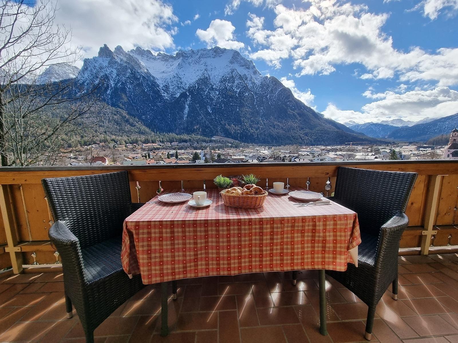 Herrlicher Panorama-Balkon, möbliert, mit Blick über Mittenwald und das Karwendelgebirge.
