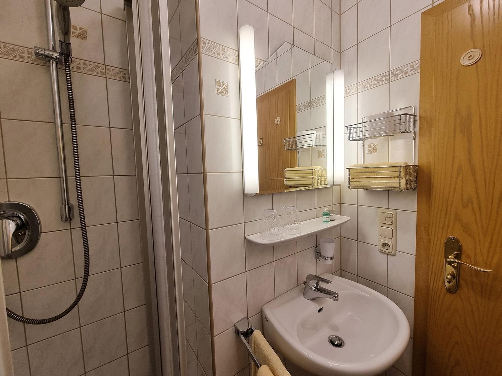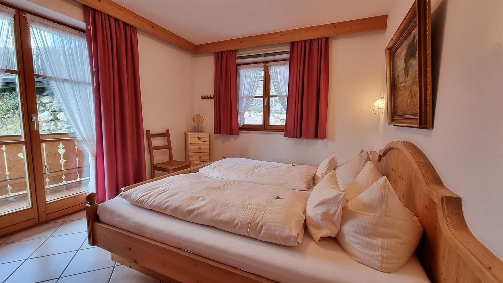 Freundliches helles Schlafzimmer mit Doppelbett und Schrank. Dusche mit WC.