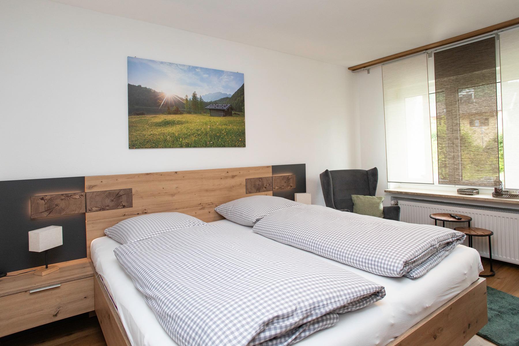 Das helle, im alpinen Stil eingerichtete Appartement "Auszeit", ist umfassend renoviert und bietet mit der südseitig orientierten Terasse schönen Ausblick Richtung Karwendel- und Wettersteingebirge.