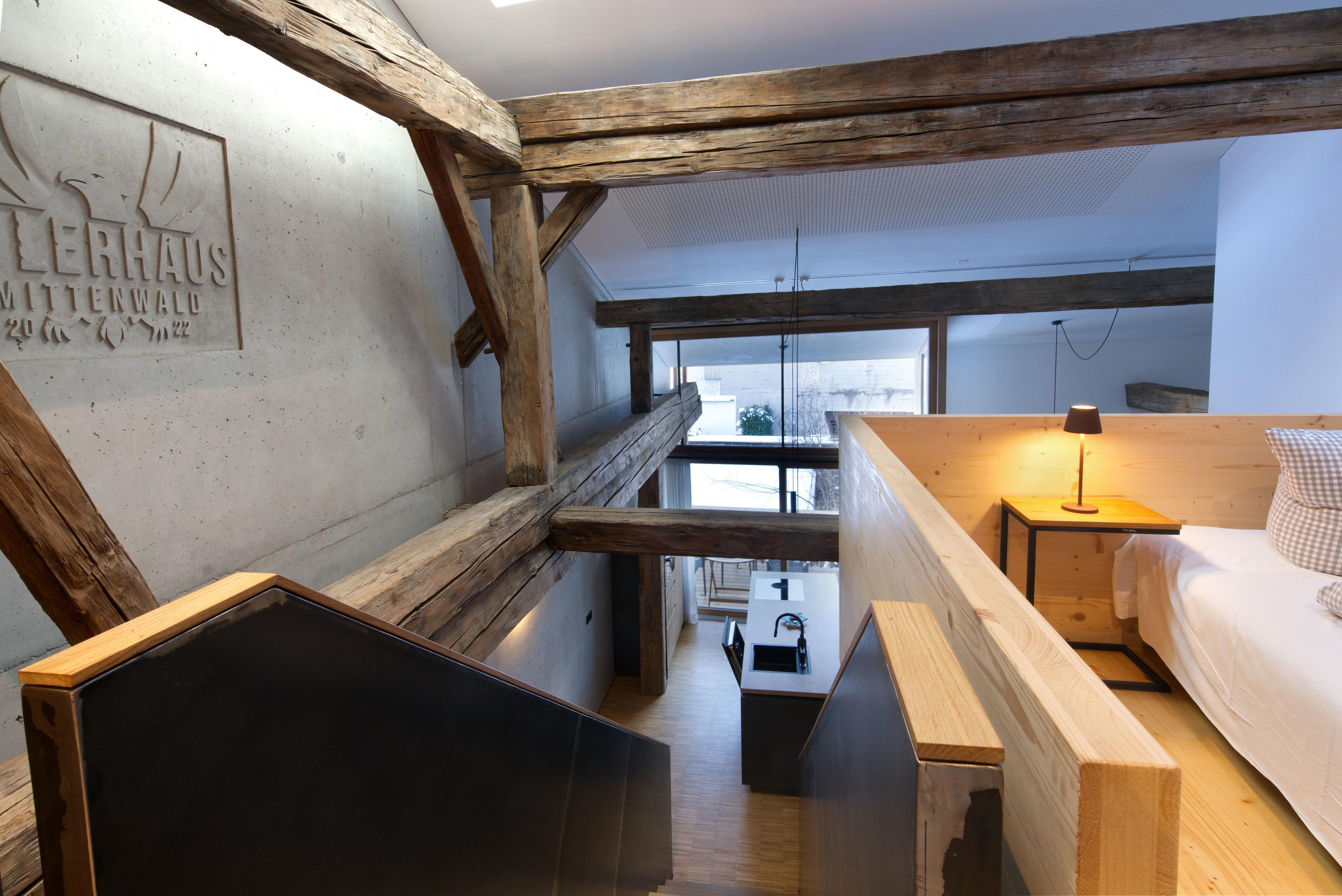 Das "Adlerhaus" ist ein traditionsreiches Mittenwalder Gebäude direkt neben der katholischen Pfarrkirche, welches 1674 erstmals urkundlich erwähnt wurde. Den Verantwortlichen gelang es in mehrjähriger, aufwändiger Detailarbeit im Rahmen des Denkmalschutzes Historie und Moderne zu Verbinden. Sichtbeton, historische Balkenkonstruktionen, sowie grossflächige Glaselemente ergänzen sich stimmig. In der ehemaligen Tenne entstanden so mehrere hochwertig eingerichtete Lofts und eine Gartenwohnung, die als Ferienwohnungen angeboten werden. Der "Obermarkt" Mittenwalds historische, verkehrsberuhigte Straße mit Gasthöfen, Cafes und Geschäften beginnt in unmittelbarer Nähe.