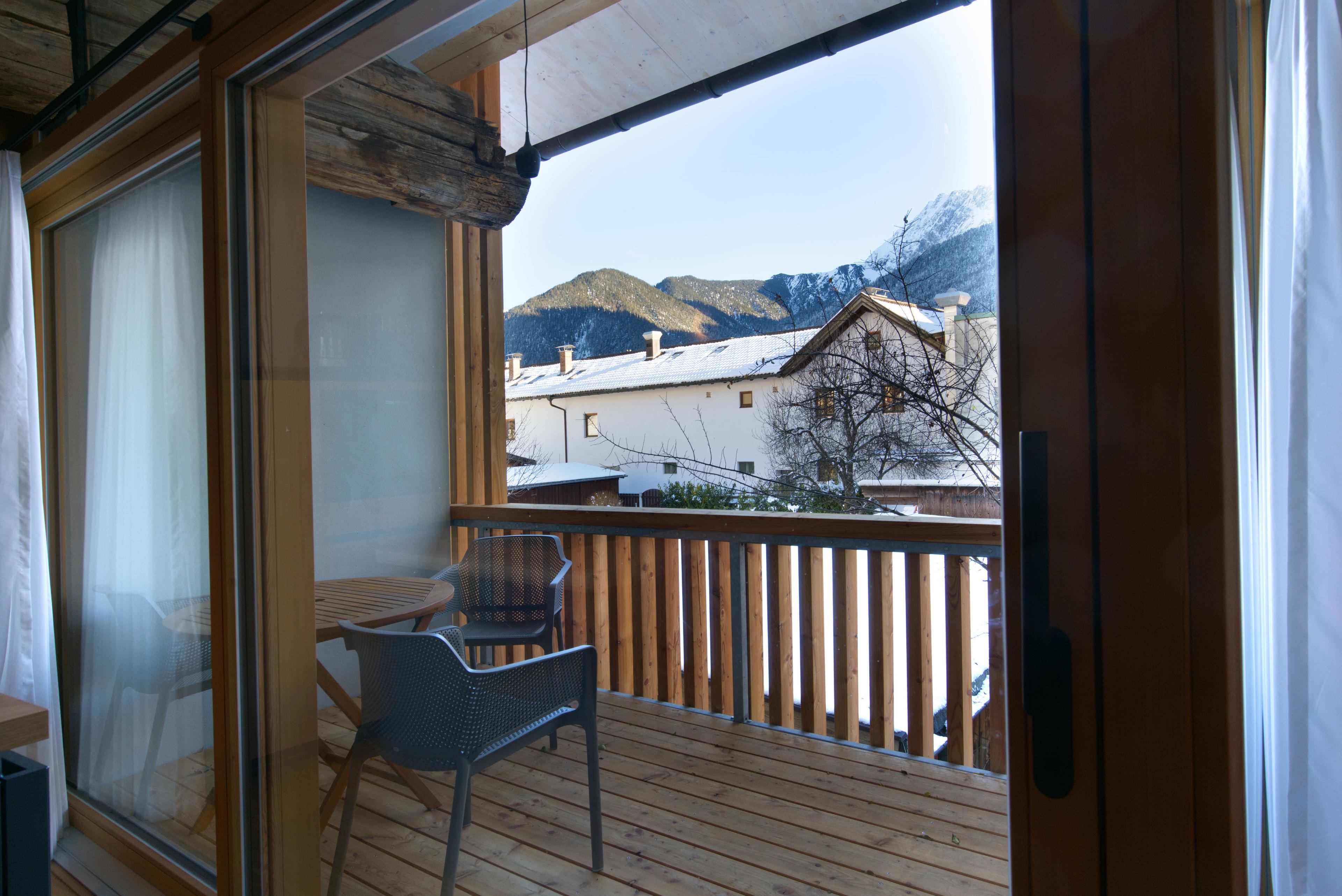 Das Loft "Gerberkreuz" erreichen Sie über das Treppenhaus aus der Parkgarage mit Zufahrt über die Ballenhausgasse. Ihr PKW-Stellplatz ist inklusive. Ein grosszügiger Essplatz mit bequemen Stühlen, ein großes Ledersofa, sowie ein Ledersessel laden zum entspannen ein. Der Blick durch die raumhohen Glastürelemente geht in den großen Garten mit Grünfläche und einem Birnbaum. Darüberhinaus ist das Karwendelgebirge zu sehen. Holzbalkon/Loggia Terrasse mit Tisch und Stühlen.