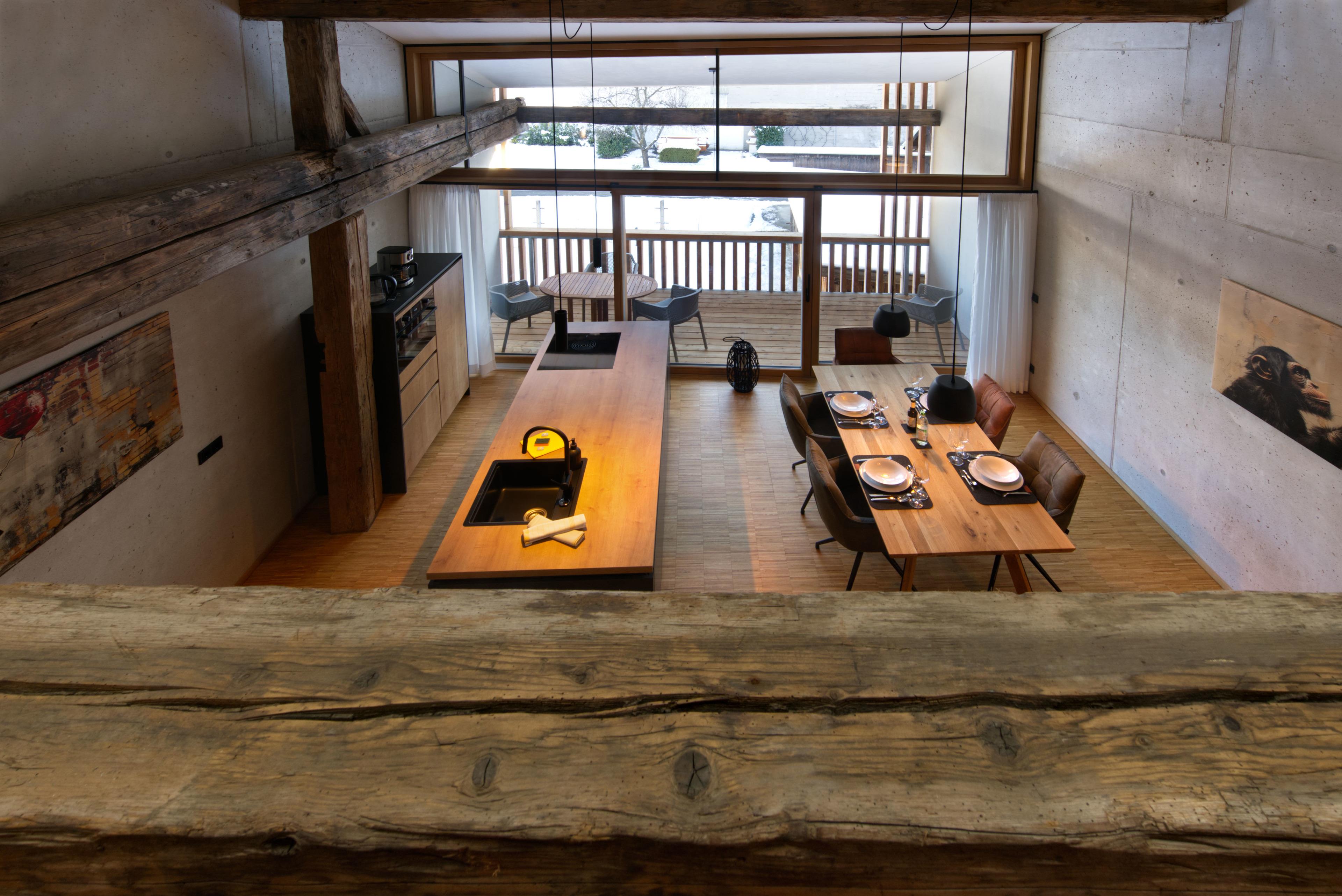 Das Loft "Viererspitz" erreichen Sie über das Treppenhaus aus der Parkgarage mit Zufahrt über die Ballenhausgasse. Ihr PKW-Stellplatz ist inklusive. Ein grosszügiger Essplatz mit bequemen Stühlen, ein großes Ledersofa, sowie ein Lederhocker laden zum entspannen ein. Der Blick durch die raumhohen Glastürelemente geht in den großen Garten mit Grünfläche und einem Birnbaum. Darüberhinaus ist das Karwendelgebirge zu sehen. Holzbalkon/Loggia Terrasse mit Tisch und Stühlen.