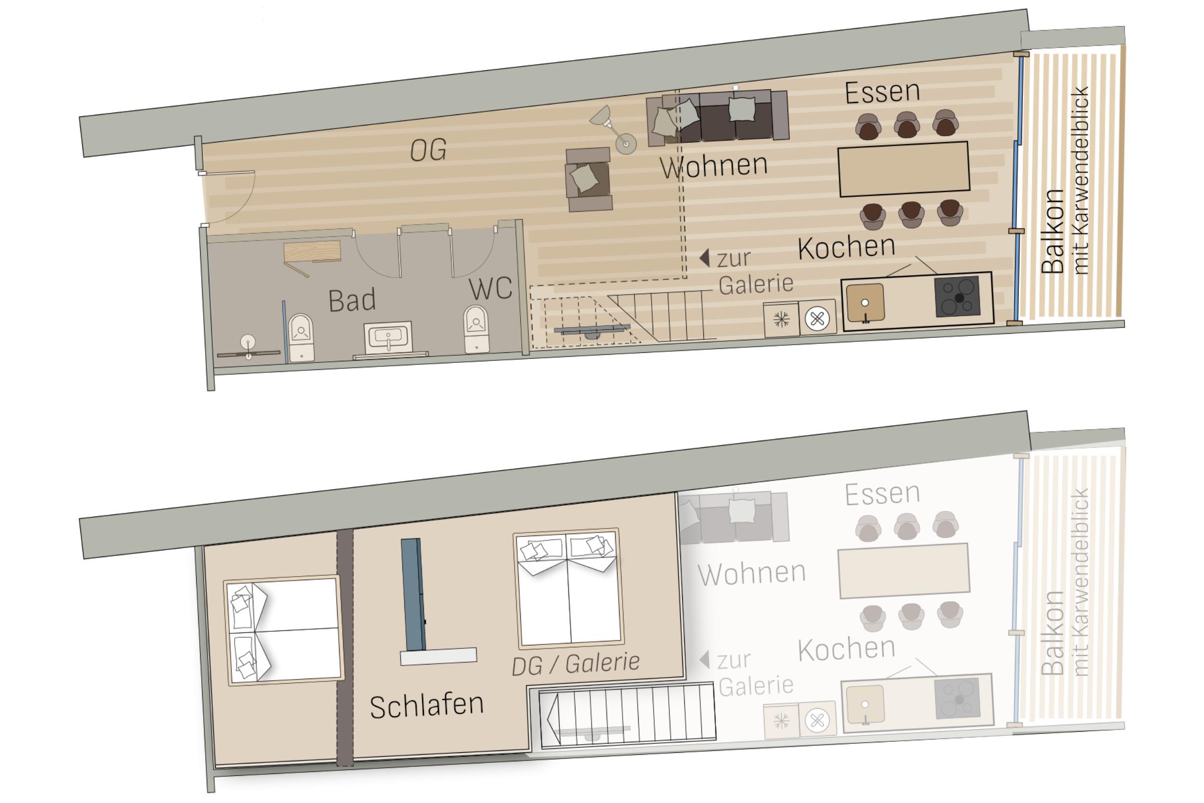 Das Loft "Wörner" erreichen Sie über das Treppenhaus aus der Parkgarage mit Zufahrt über die Ballenhausgasse. Ihr PKW-Stellplatz ist inklusive. Ein grosszügiger Essplatz mit bequemen Stühlen, ein großes Ledersofa, sowie ein bequemer Lederhocker laden zum entspannen ein. Der Blick durch die raumhohen Glastürelemente geht in den großen Garten mit Grünfläche und einem Birnbaum. Darüberhinaus ist das Karwendelgebirge zu sehen. Holzbalkon/Loggia Terrasse mit Tisch und Stühlen.