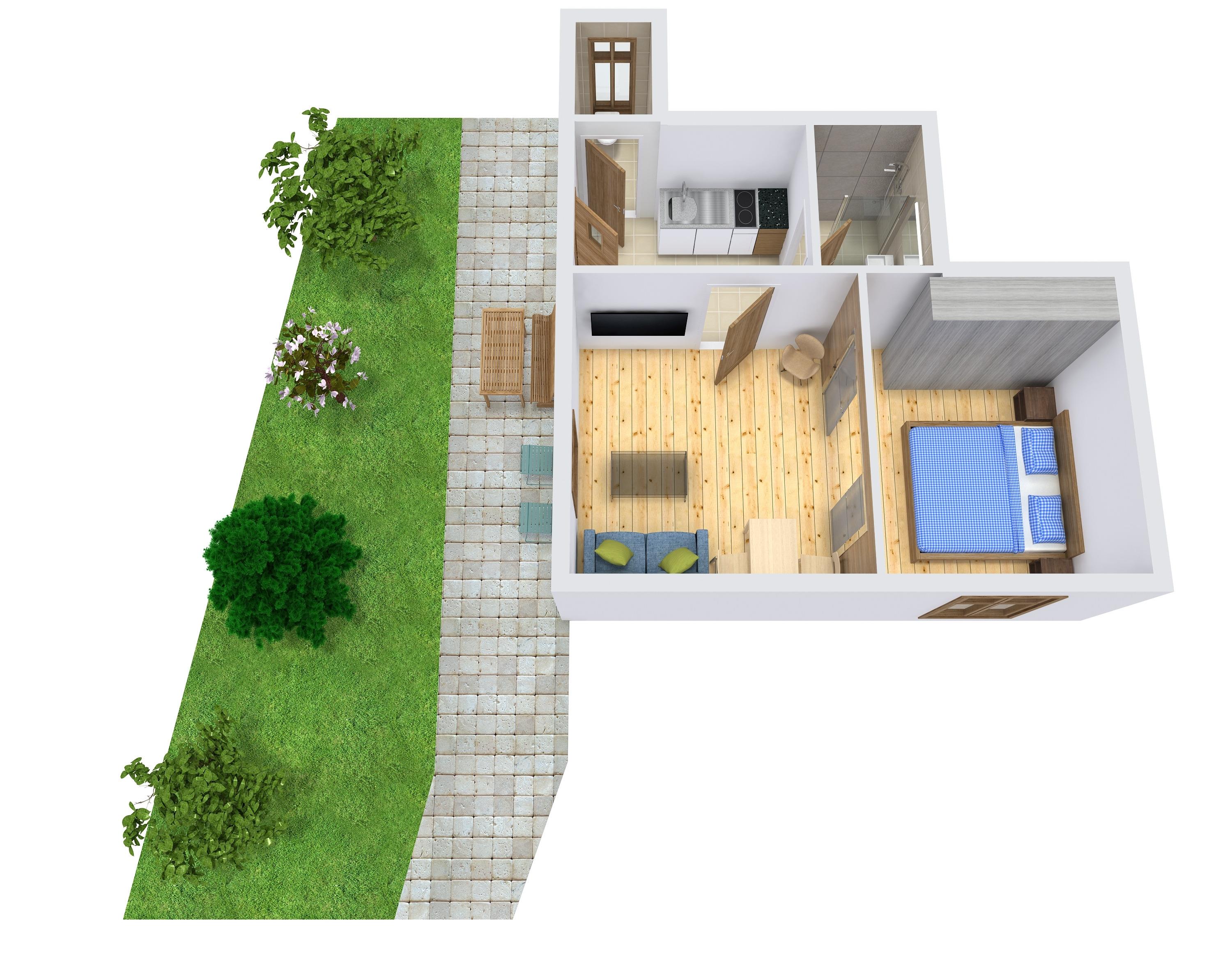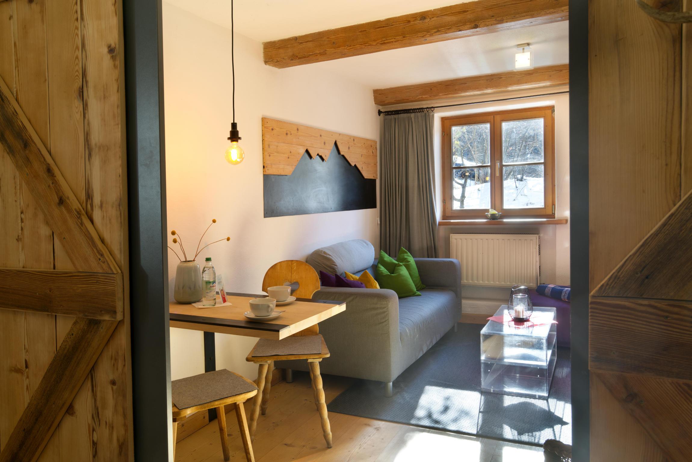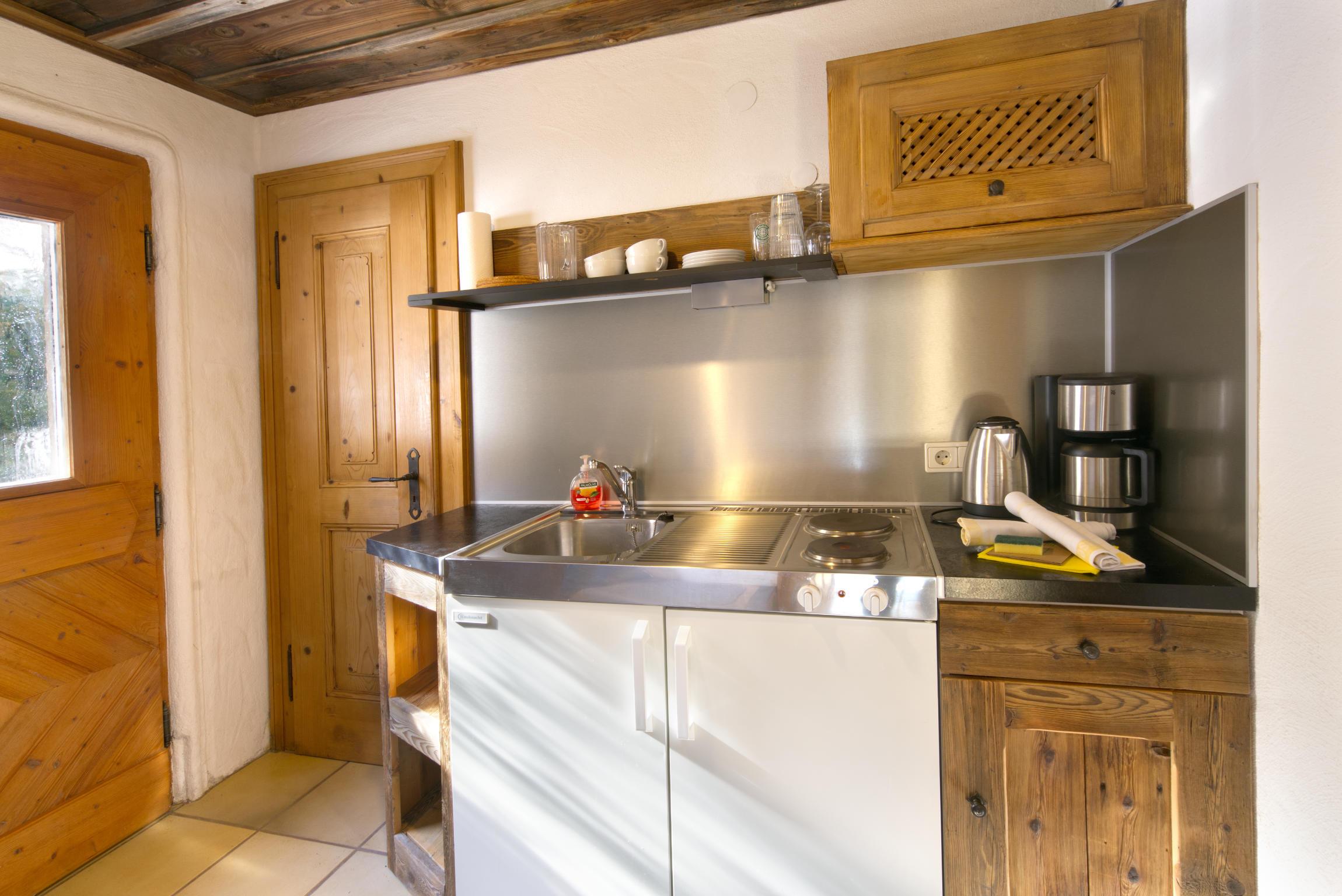 Gemütliche, mit viel Altholz stilvoll eingerichtete, kleine Wohnung im Ergeschoss. Die Wohnung hat einen eigenen Zugang von aussen, so dass Sie durch kein Treppenhaus gehen müssen. Am Eingang befindet sich eine Sitzgruppe mit Holzbank und Stühlen. Ideal für Einzelpersonen und Paare. Wohnzimmer mit Sofa, TV. Kleine Küchenzeile mit 2-Plattenherd. Separate DU/WC