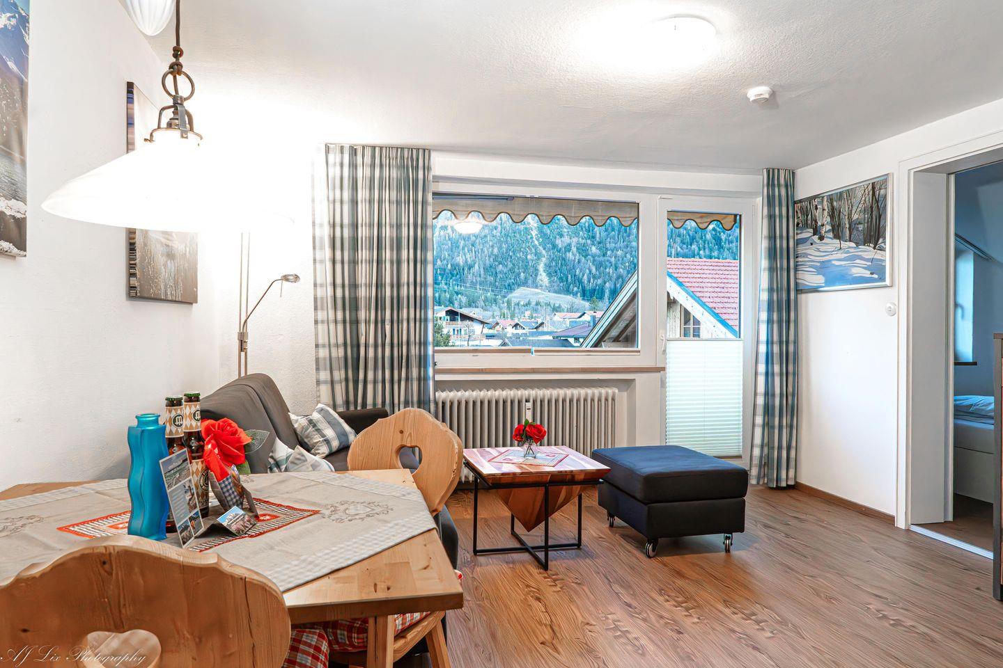 Im Schlafzimmer befinden sich zwei Einzelbetten, der gemütliche Wohnbereich verfügt über eine kuschelige Sitzecke mit Blick auf den großzügigen, möblierten Balkon mit Traumblick auf das Karwendelmassiv.