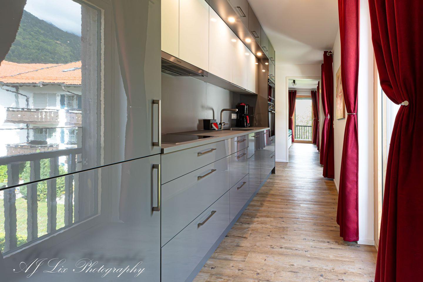 Die voll ausgestattete, hochwertige Küche mit Geschirrspüler, Induktionsherd, Nespressomaschine und Mikrowelle befindet sich rondellartig an der Rückseite der Fewo, so dass sie von beiden Seiten betreten und genutzt werden kann.