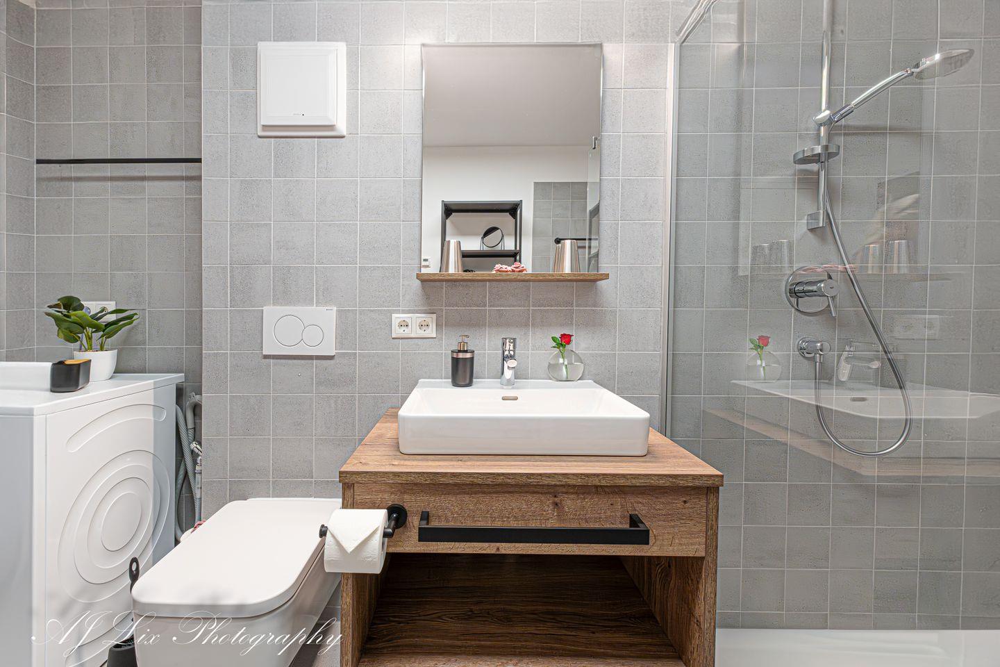 Das große, neue Badezimmer ist mit einer bodengleichen Dusche und sogar mit Waschmaschine ausgestattet, damit Sie sorgenfrei hier auch länger Ihren Familienurlaub verbringen können.