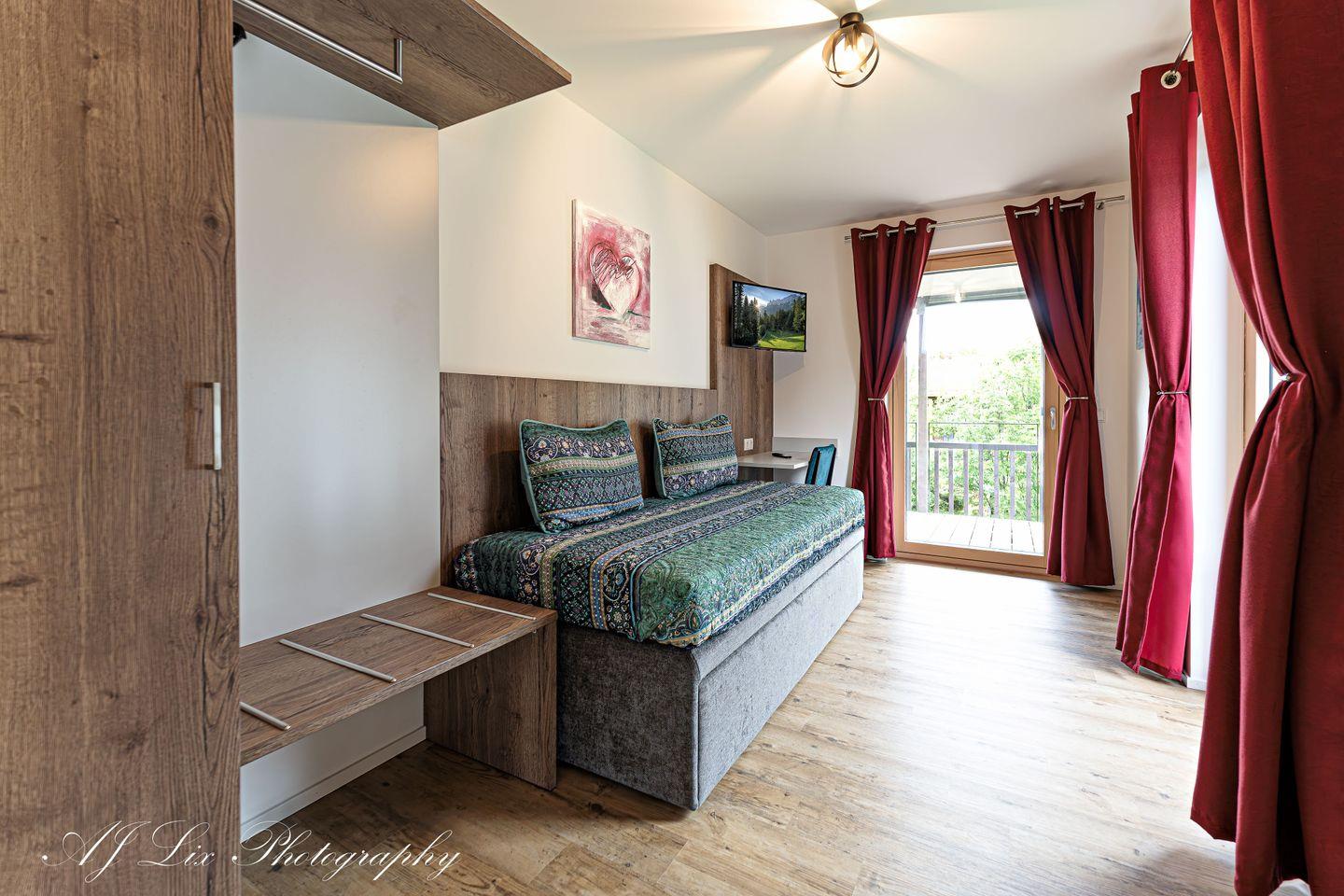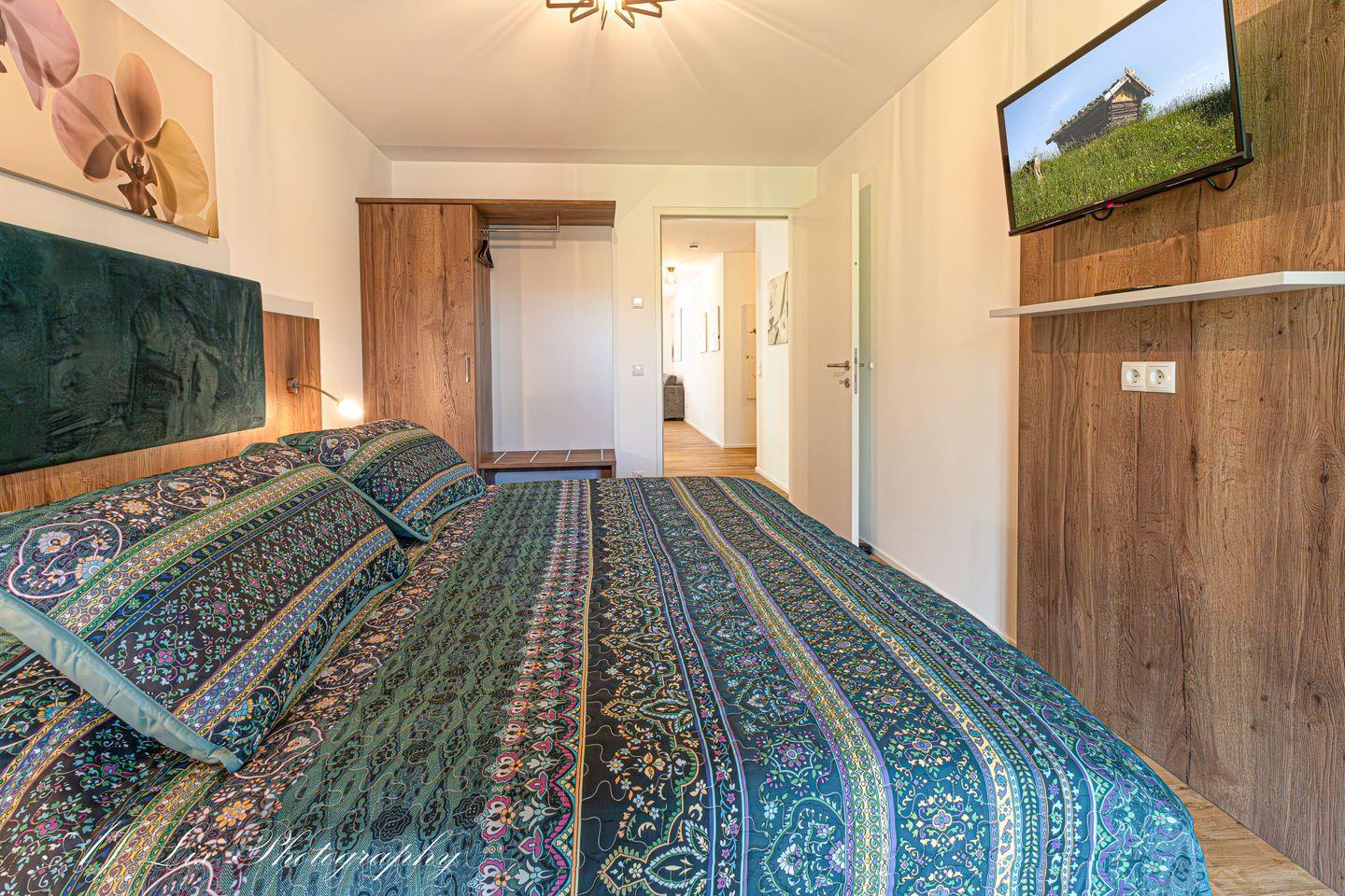 Der großzügige Wohnbereich lädt zum Entspannen und gemeinsamen Zusammensitzen ein, hier befindet sich ein TV mit 50 Zoll Bildschirmgröße. Im Schlafzimmer erwartet Sie ein erhöhtes Doppelbett, natürlich mit eigenem TV. Ein Arbeitszimmer, dass sich ebenfalls als Schlafzimmer, nutzen lässt, verfügt über ein hochwertiges Einzelbett (90x200cm) mit Ausziehmöglichkeit (80x190cm) zu einem vollwertigen, komfortablen Doppelbett.