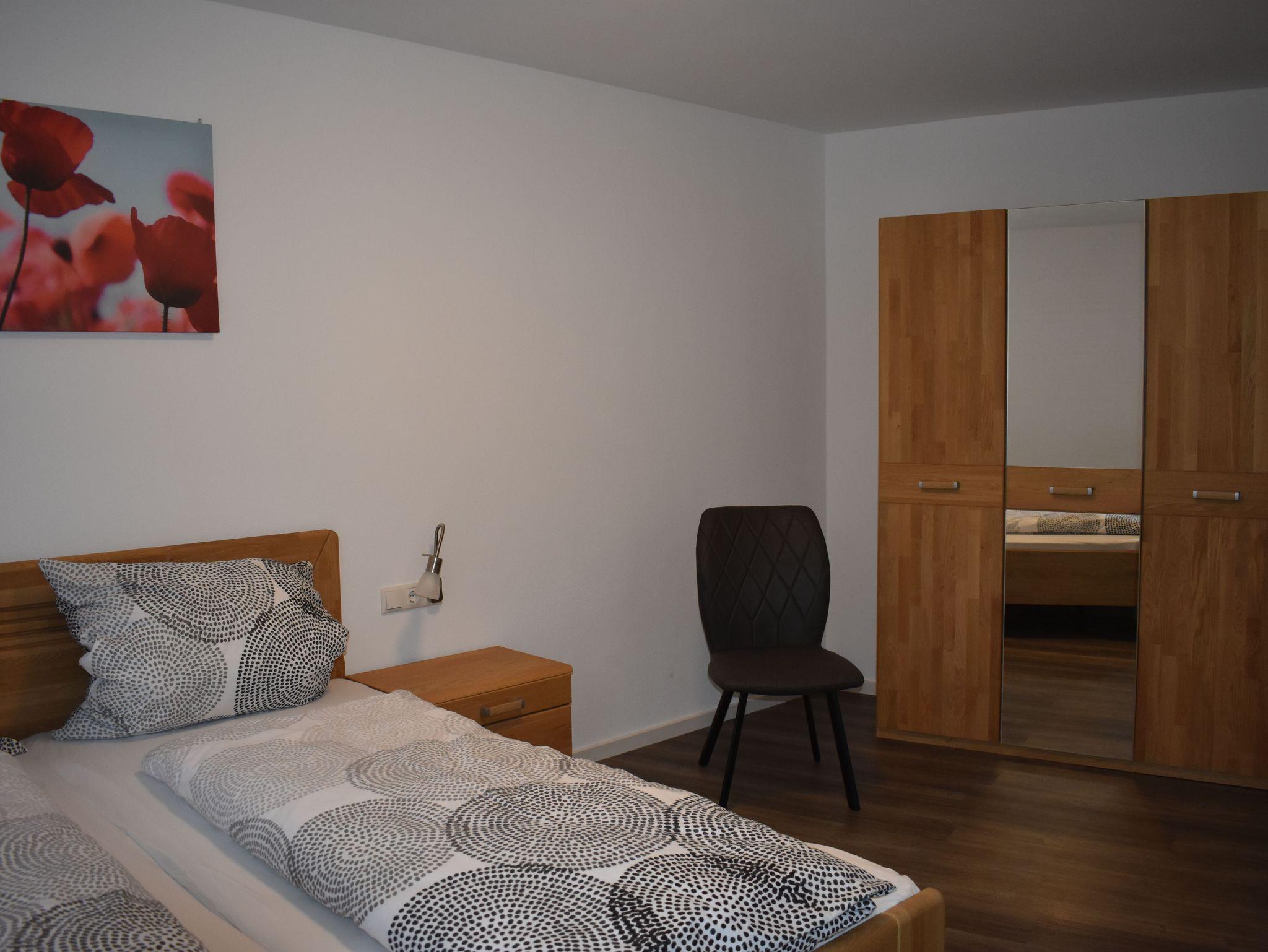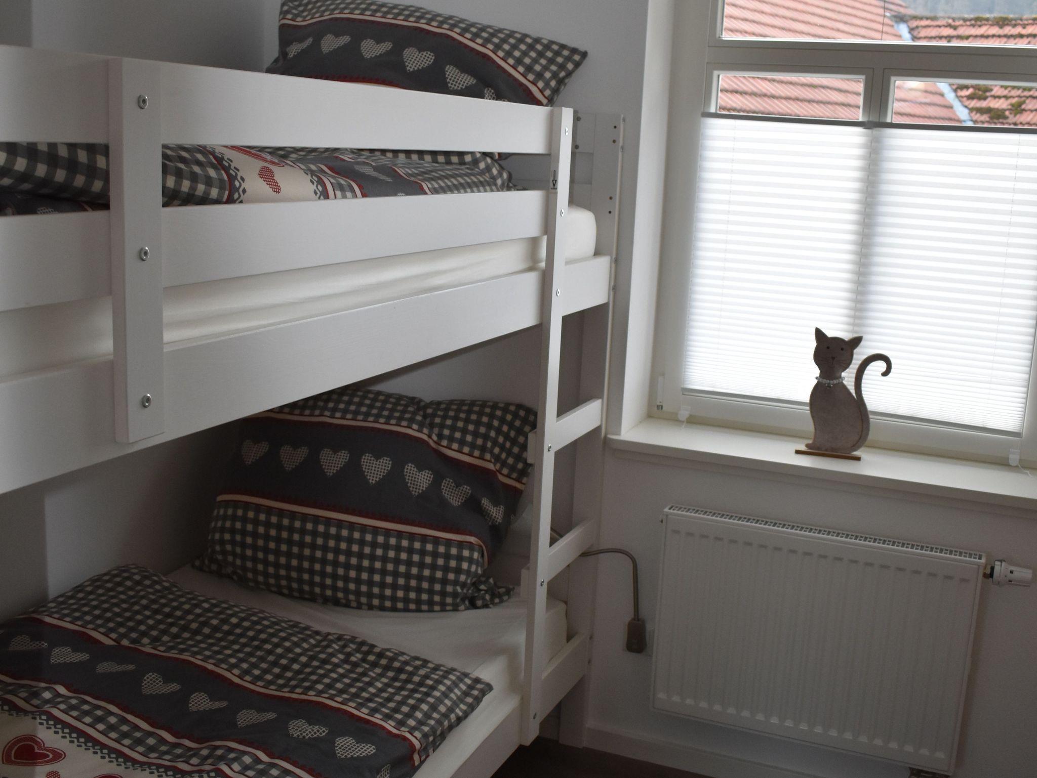 Eine neugebaute modern mit Vinylboden eingerichtete Ferienwohnung für 4 Personen, in ruhiger Lage, in Richtung Süden ausgerichtet. Nichtraucherwohnung. Elternschlafzimmer: Doppelbett 180 cm x 200cm, Schrank mit Spiegel. Kinderzimmer Etagenbett 90cm x 200 cmm und Schrank. Alle Betten sind bezogen. Bad: Dusche, Toilette, Waschbecken, Föhn, Kosmetikspiegel und Handtücher.