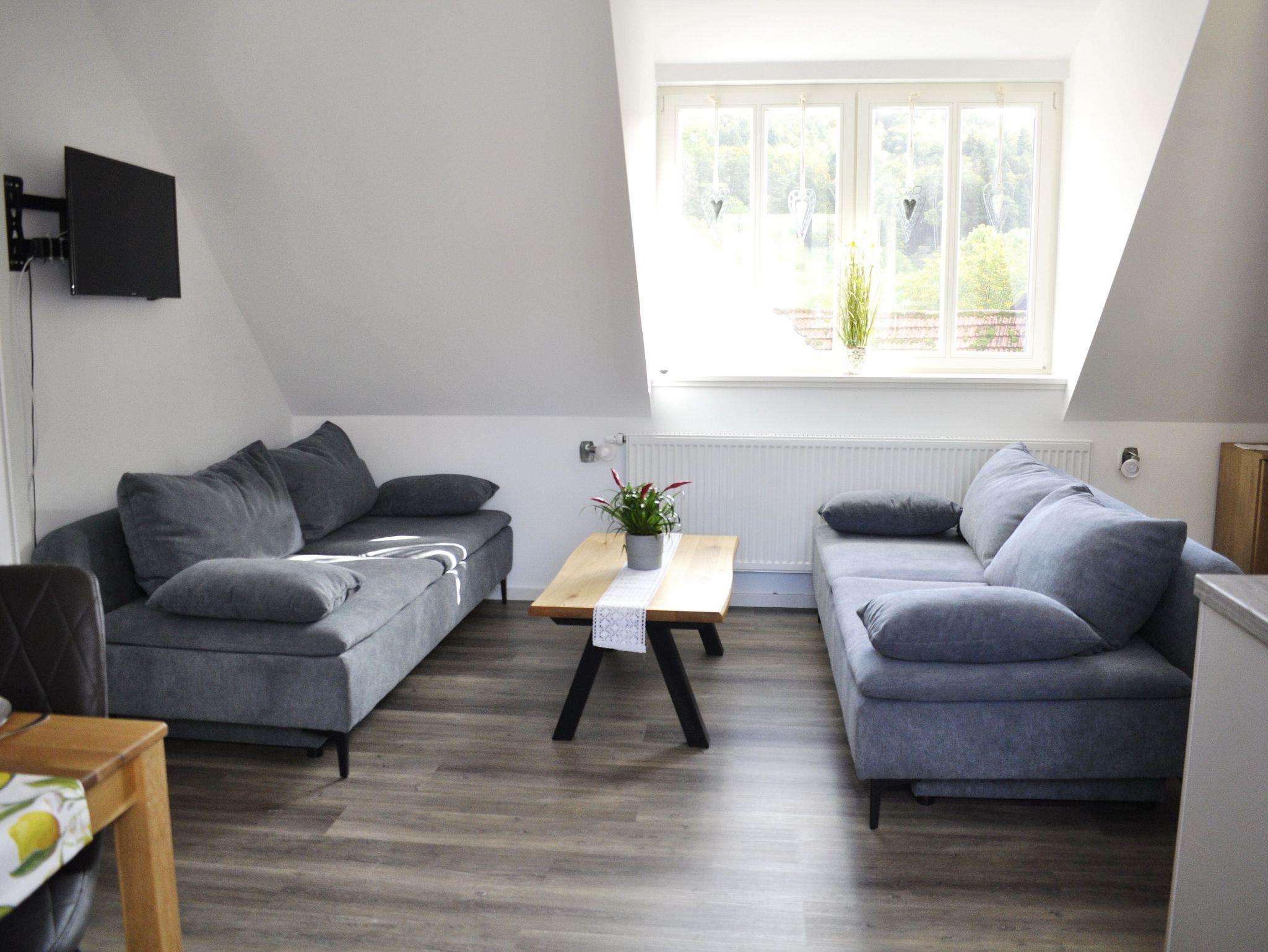 Eine neugebaute modern mit Vinylboden eingerichtete Ferienwohnung für 4 Personen, in ruhiger Lage, in Richtung Süden mit Panoramablick ausgerichtet. Nichtraucherwohnung. Elternschlafzimmer: Doppelbett 180 cm x 200cm, Schrank und Spiegel. Für jede weitere Person stehen 2 Schlafsofas 140 cm x 200 cm zur Verfügung. Bad: Dusche, Toilette, Waschbecken, Föhn, Kosmetikspiegel und Handtücher.