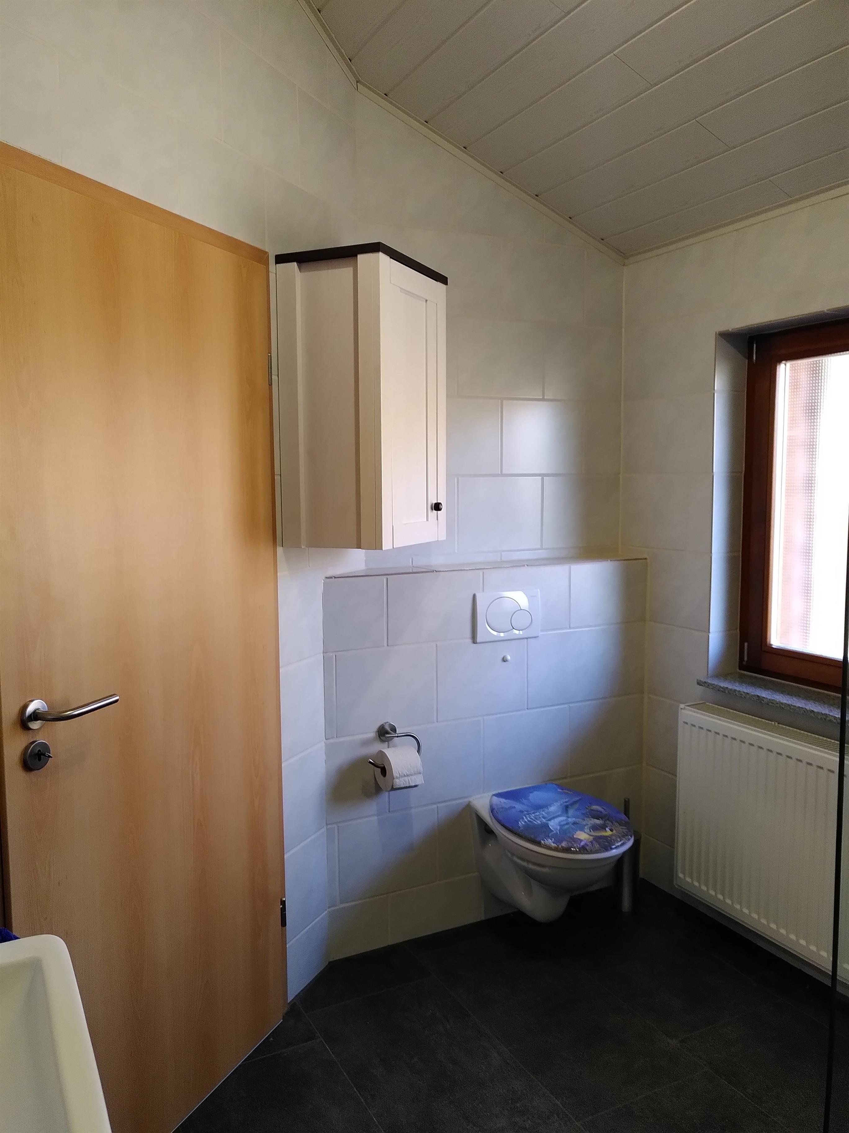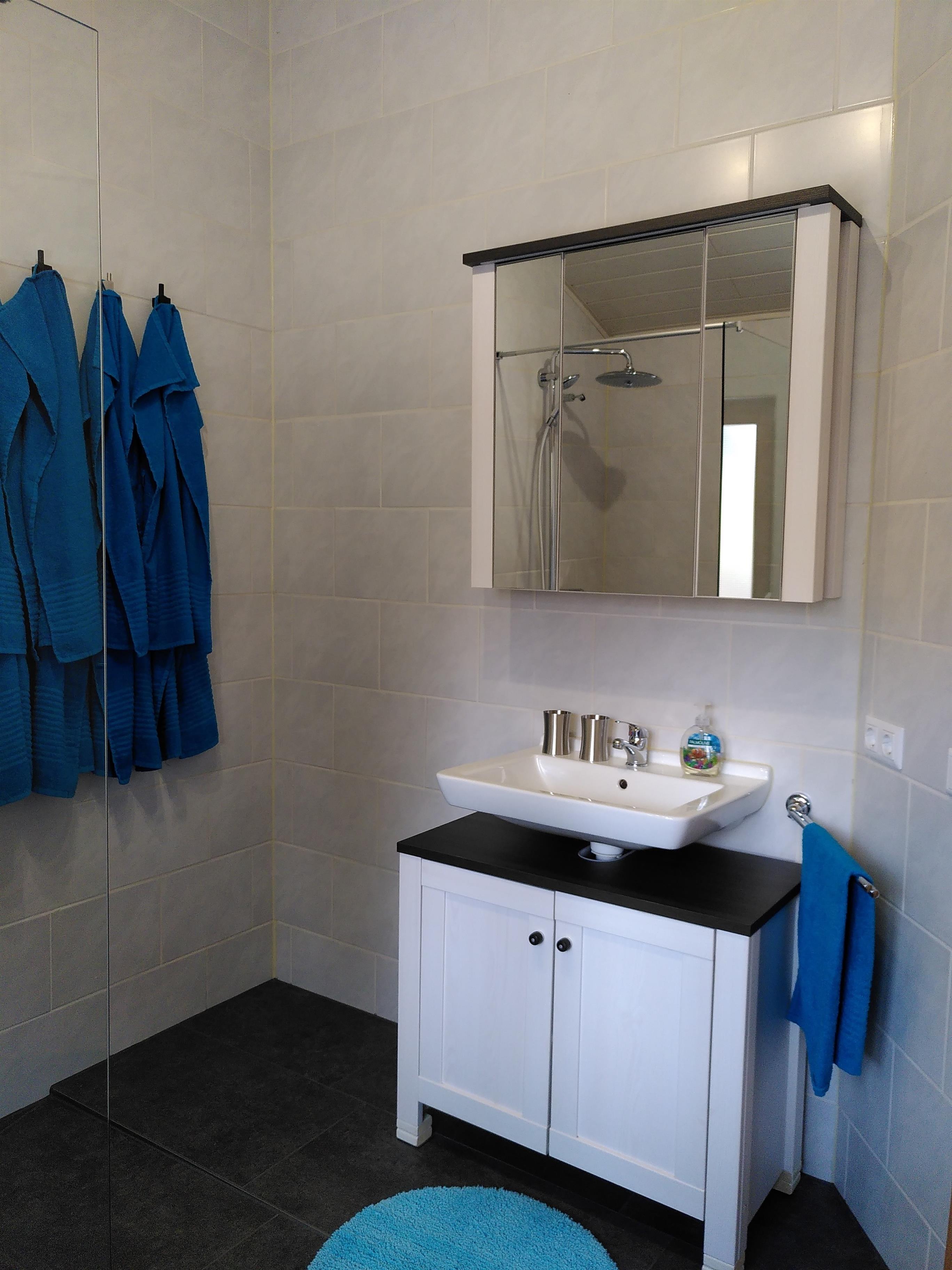 Das ungewöhnlich geschnittene Tageslicht-Bad mit großer Regendusche ist ein echtes Erlebnis. Zur Ausstattung des Badezimmers gehören neben dem WC und frischen Handtüchern auch ein Föhn. Zusätzlich gibt es noch ein separates Gäste-WC mit Waschbecken.