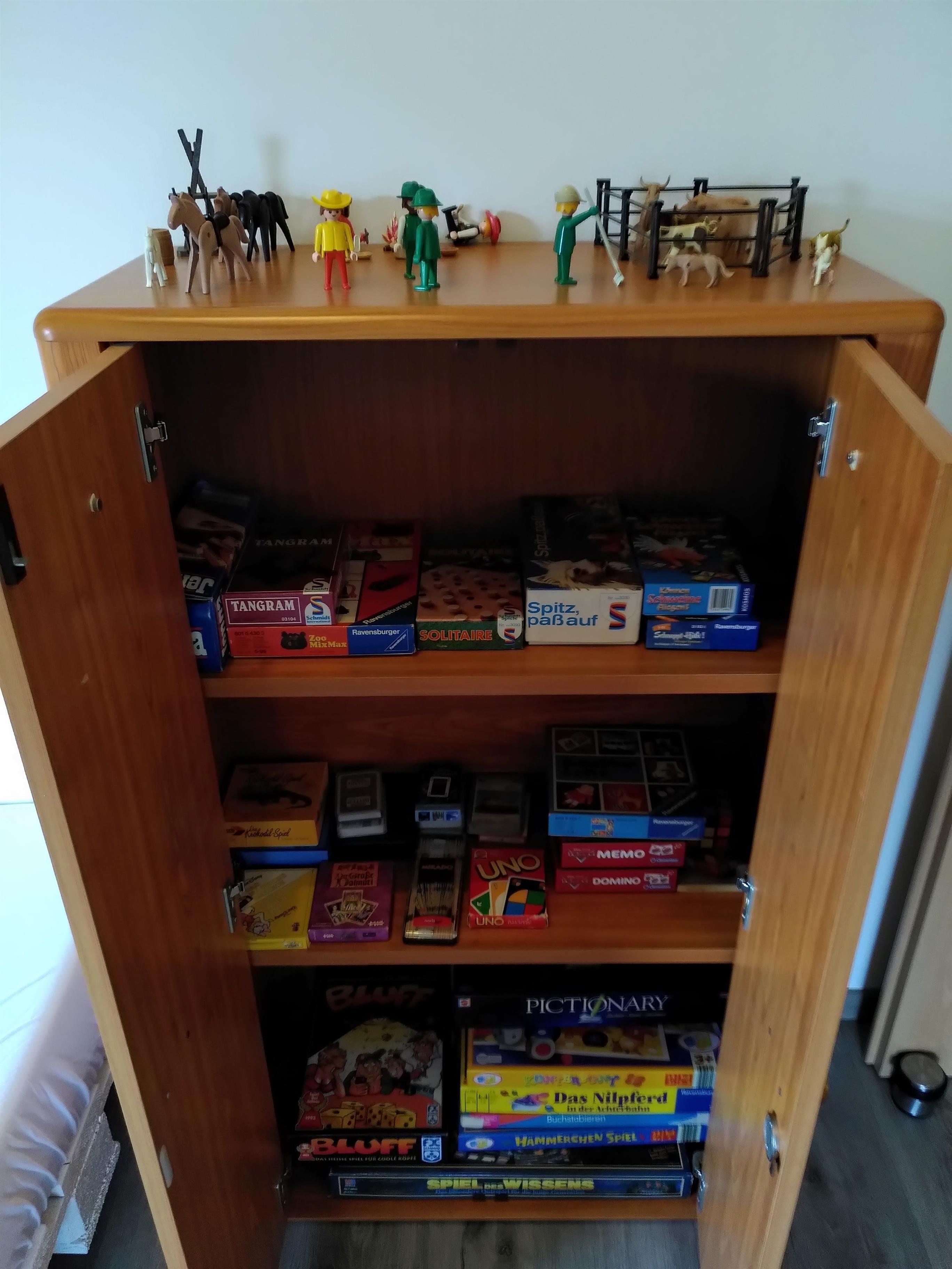 Großzügig eingerichte Wohnung für 5 Personen mit 2 Schlafzimmern. Im Elternschlafzimmer befinden sich ein Kleiderschrank und ein Doppelbett aus Paletten im DIY-Stil, auf Wunsch können die Betten auch als Einzelbetten aufgestellt werden. Im Kinderzimmer stehen 2 Einzelbetten im selben Stil zur Verfügung. Außerdem stehen dort ein Schrank voller Gesellschaftsspiele und eine Hörbuch-Sammlung mit CD-Player. Frische Bettwäsche gehört selbstverständlich mit zur Ausstattung aller Schlafzimmer.