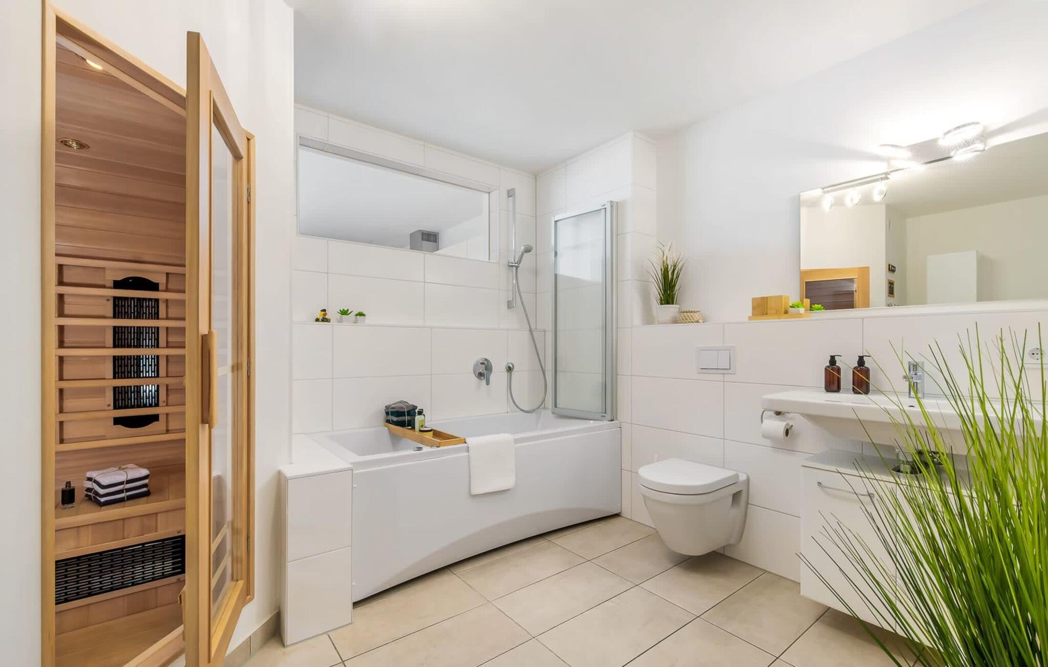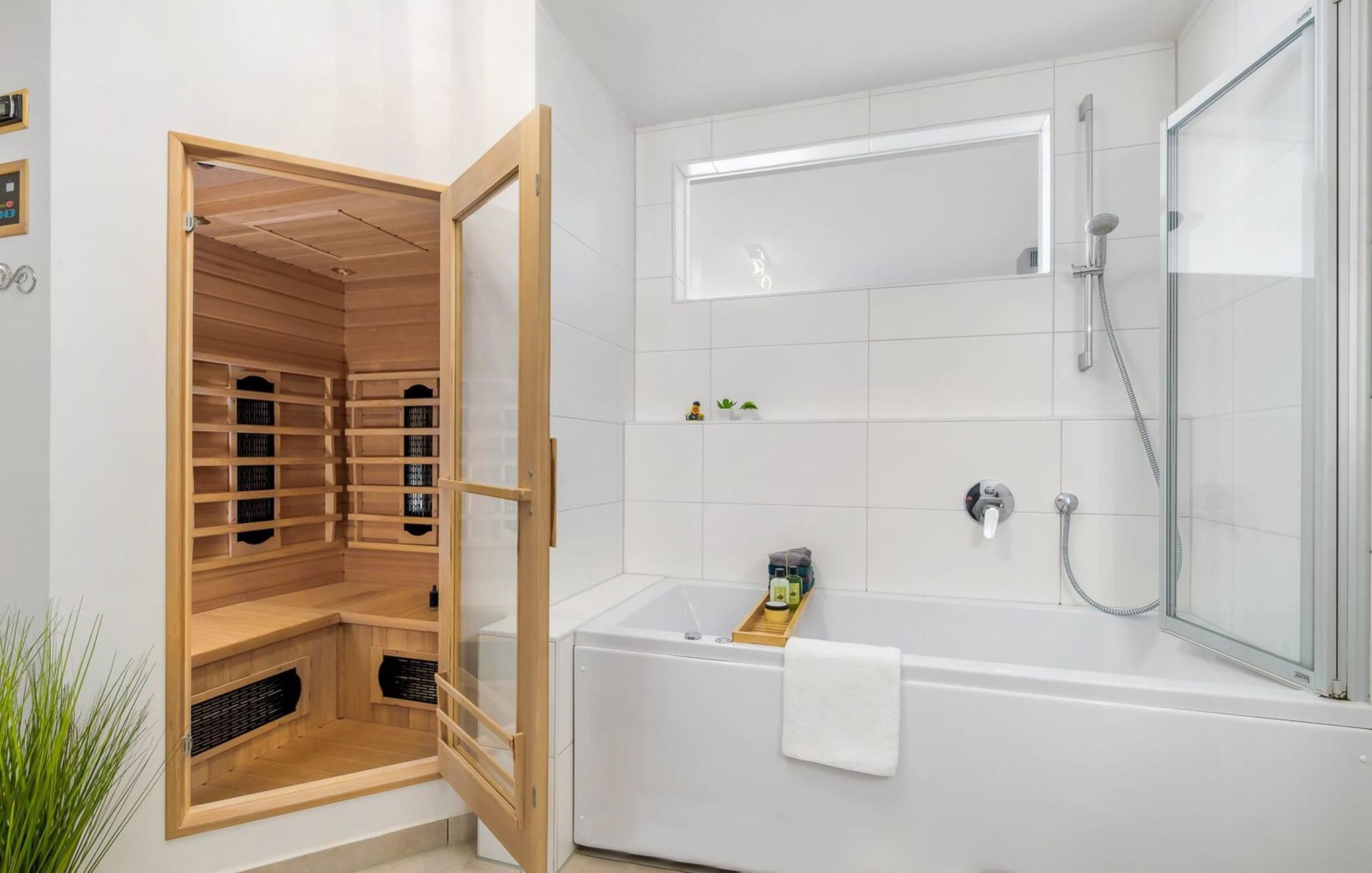 Kun få meter fra Weidefelds sandstrand og havnepromenaden i OstseeResort Olpenitz imponerer denne ferielejlighed med sin centrale beliggenhed, en fantastisk udsigt over vandet og topfaciliteter. I kan nyde morgen- og aftensolen på to terrasser. Det grønne område omkring huset indbyder til solbadning, leg og afslapning. Wellnesselskere vil få noget for pengene En infrarød varmekabine med hi-fi lydsystem og LED farvelysterapi samt et afslappende spabad inviterer jer til at slappe af efter en gåtur på stranden. Fantastisk udsigt åbner op fra opholdsstuen og på den tilstødende terrasse med udsigt over lystbådehavnen. Havnebiografen sørger for underholdning under en hyggelig grillaften eller en romantisk middag med levende lys ved solnedgang. WiFi og Smart TV med Telekom Home Entertainment-program sørger også for indendørs underholdning. På ferien er der tid til kreativ madlavning, det fuldt udstyrede køkken-alrum lader intet tilbage at ønske. Morgenmad i morgensolen på østterrassen, ren feriefølelse. De to soveværelser med udgang til den østvendte terrasse er ligeledes indrettet til høj standard og nænsomt møbleret. Og vågner I tidligt og veludhvilet på ferien, kan I se billedskønne solopgange på den tilstødende terrasse. Det store soveværelse er også udstyret med endnu et Smart LED TV. Gulvvarme, boblebad og sauna lover komfort i hver sæson. Og på den hyggelige sofa bag panoramavinduets front giver det nordiske vejr en helt særlig hygge i den mørke årstid. Der er privat parkeringsplads og cykelskur foran huset. Ferielejligheden er en lejlighed i stueetagen. Vores favoritsted: Efter en lang gåtur på stranden kan I få en wellness-session og derefter slappe af på terrassen med en solnedgang og se havnebiografen. Bemærk venligst: OstseeResort Olpenitz er meget populært, og der bygges fortsat i parken. Ikke desto mindre kan I se frem til en 5-stjernet standard og et førsteklasses ophold. Byggeaktiviteterne kommer ikke til at forstyrre jer på ferien, og derfor gives der ikke yderligere afslag i prisen.