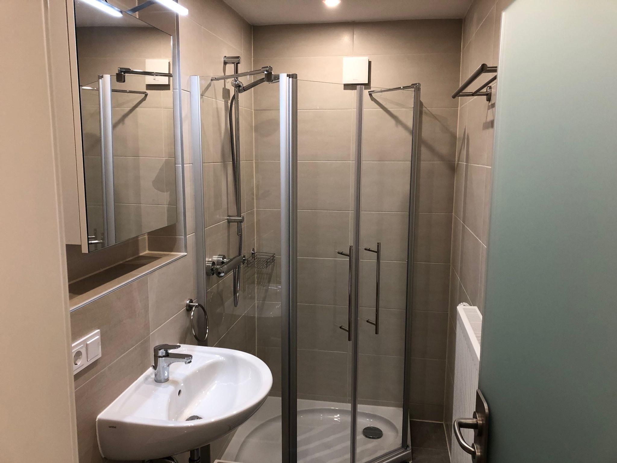 Bad mit Dusche und WC, Handtuchheizkörper, Fön, Spiegelschrank