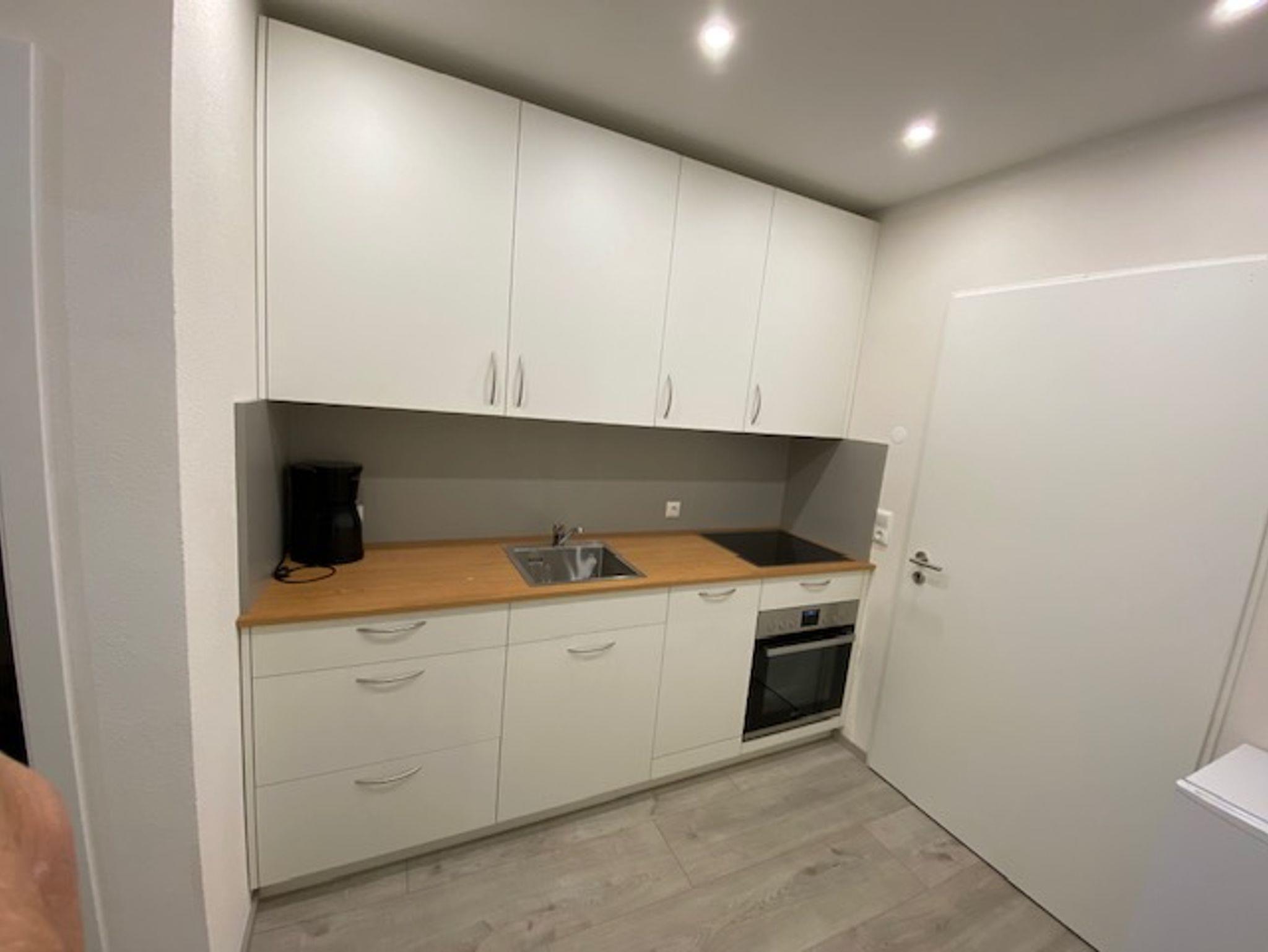 - gut ausgestattete Küchenzeile mit Backofen, Kochfeld, Dunstabzug, Spülmaschine, Kaffeemaschine, Kühlschrank, Geschirr, Töpfe, Besteck