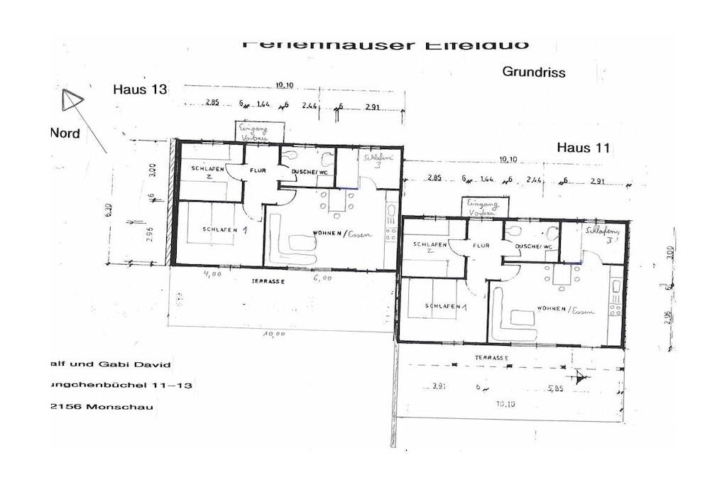 Feriehusene Eifelduo 11 og 13 er hver cirka 60 kvadratmeter store og tilbyder en fantastisk udsigt over Eifel-landskabet. De har tre soveværelser til fem personer, og en barneseng/højstol kan stilles til rådighed gratis efter anmodning. Husene ligger lige ved siden af hinanden, hvilket giver mulighed for at leje begge huse samtidigt for op til ti personer ved at åbne det eksisterende hegn (10 meter langt) via en forbindelsesdør. Feriehusene har et kombineret opholds- og køkkenområde med fladskærms-tv og et fuldt udstyret tekøkken med køleskab (med integreret fryser), elektrisk komfur med ovn, opvaskemaskine, mikrobølgeovn, filterkaffemaskine, Senseo-kaffemaskine, elkedel, brødrister og rigeligt med service. Der er også en vaskemaskine til rådighed. Det rummelige, fuldt indhegnede udendørsområde tilbyder en stor terrasse, havemøbler, grill og legeredskaber (klatrestativ med rutsjebane og sandkasse, fodboldmål, trampolin) samt flere bænke. Renslige hunde er velkomne.