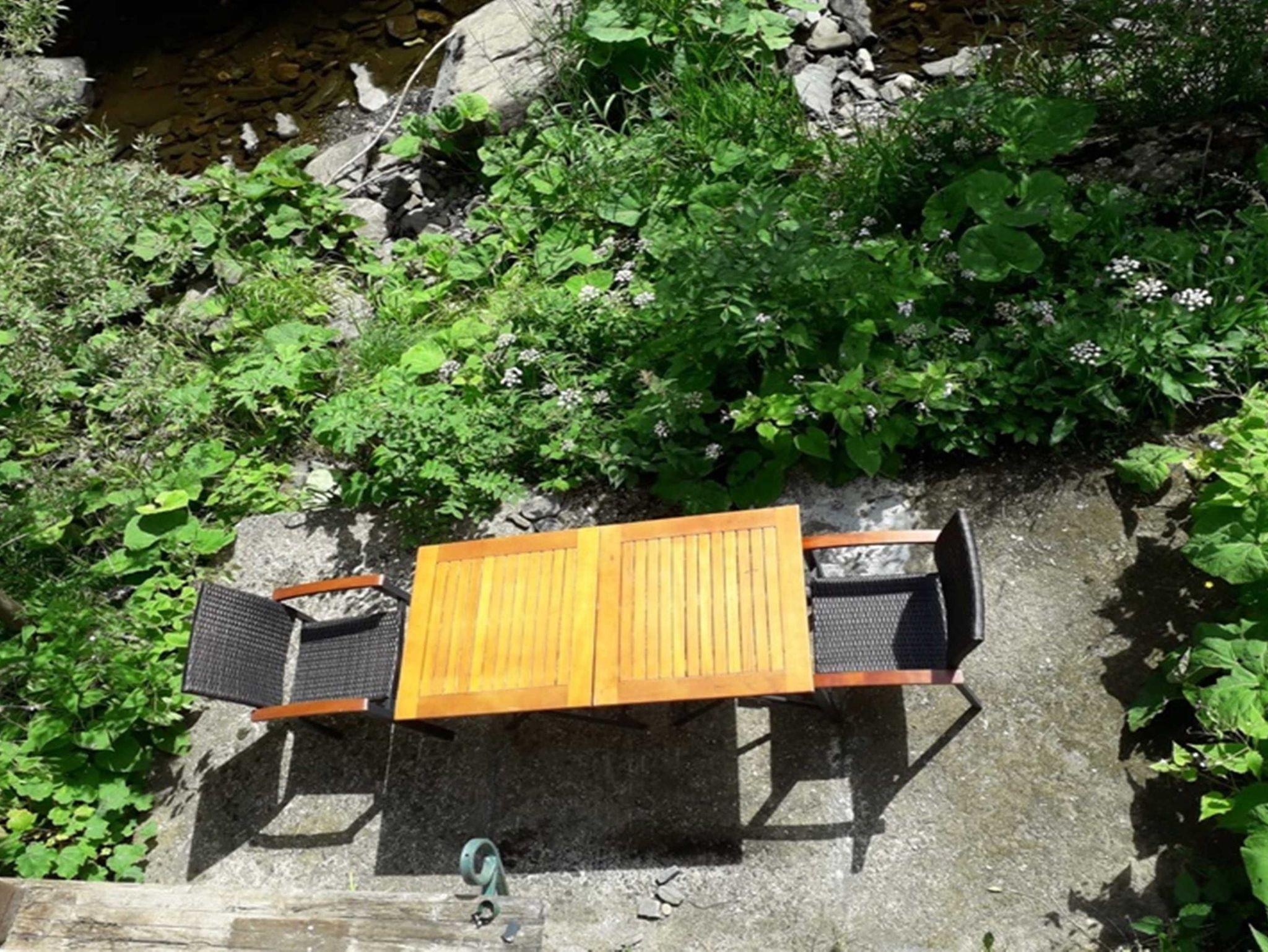 Kleine Terrasse mit Gartenmöbeln (2 Tische, 6 Stühle finden Platz)