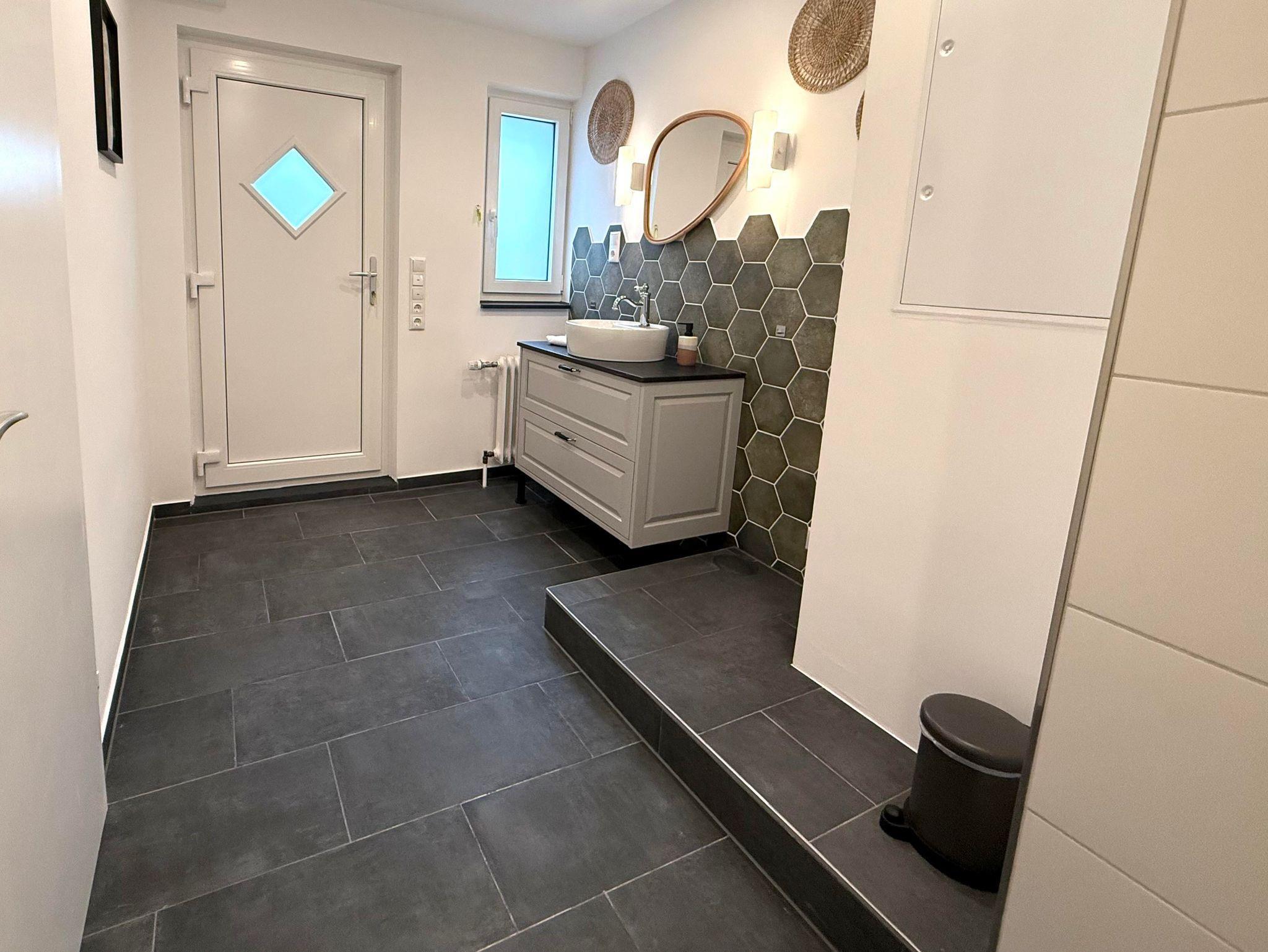 Das Badezimmer im Obergeschoss bietet eine geräumige Dusche, eine Badewanne und einen Einbauschrank. Ein Föhn ist ebenfalls vorhanden. Zusätzlich gibt es im Erdgeschoss einen Waschraum mit großzügigem Waschtisch und Toilette.