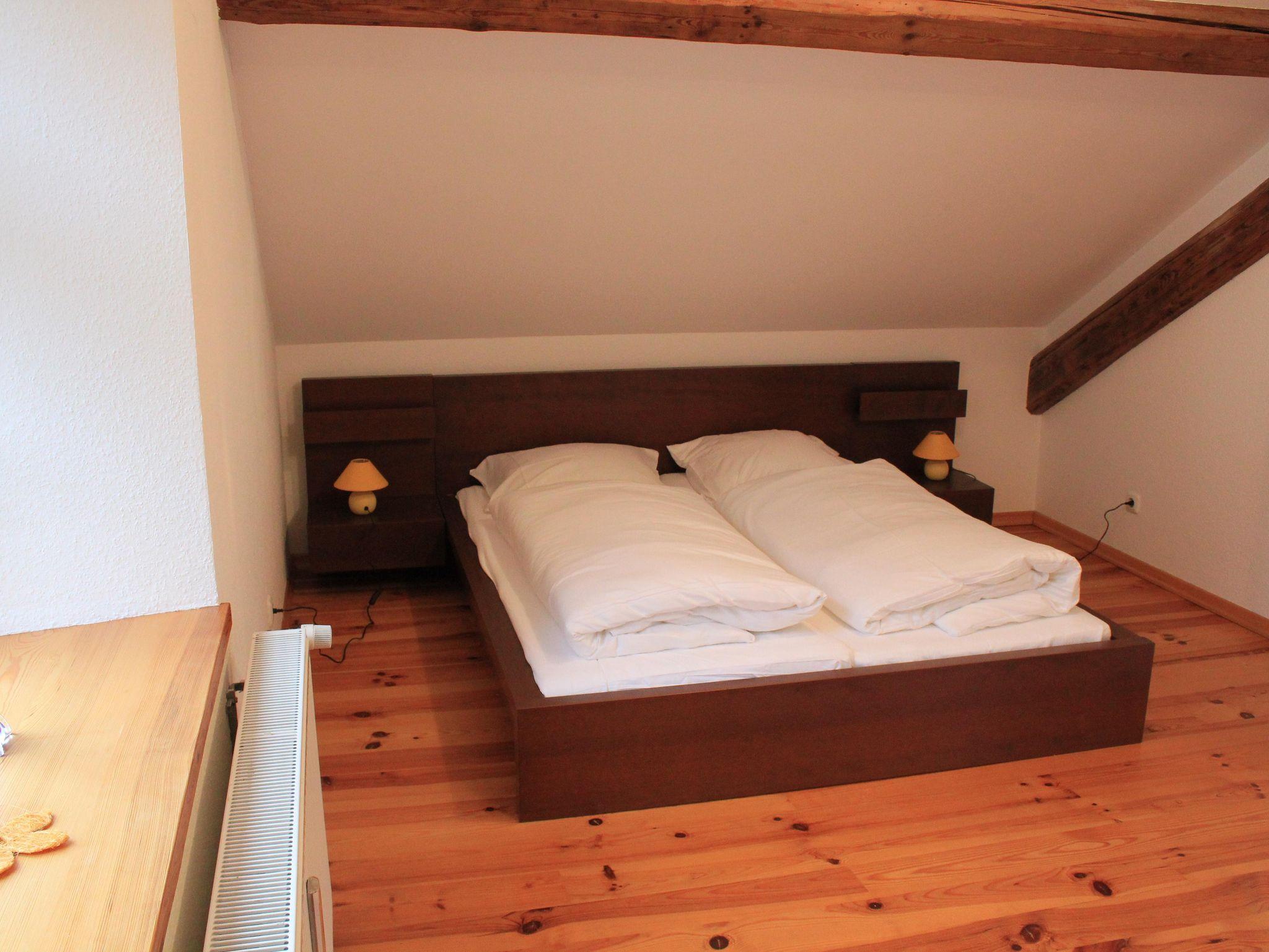 Im Schlafbereich gibt es zwei Doppelzimmer und ein Dreibettzimmer. Auf einer offenen Empore kann zusätzlich ein Klappbett aufgestellt werden.