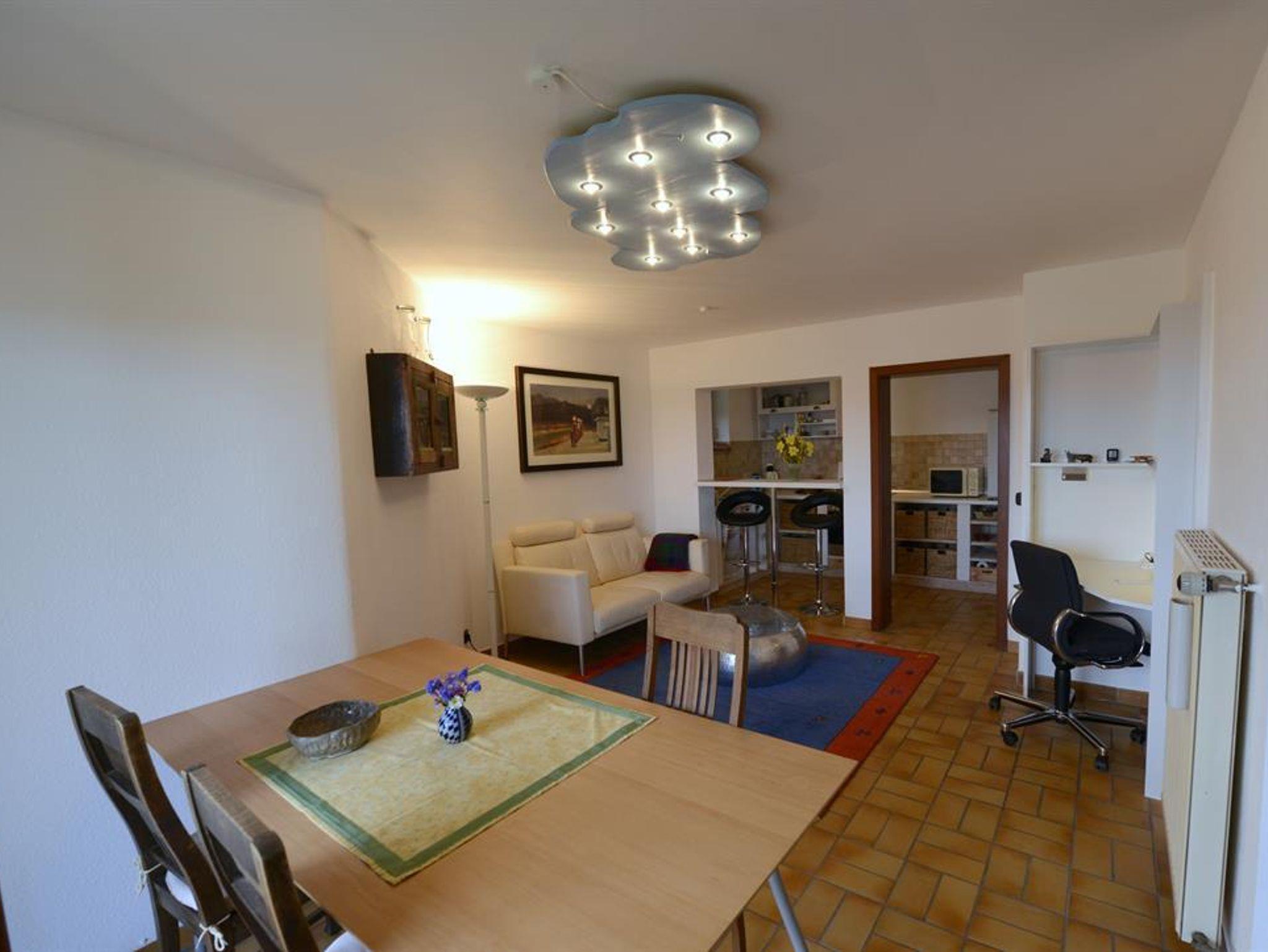 Sämtliche Zimmer sind verbunden. Die Küchenzeile ist ergänzt um eine Frühstücksbar. Eine Ecke des Wohnbereichs ist als Büro-/Arbeitsbereich ausgestattet. Die Warmwasserversorgung ist dezentral organisiert. WC/Duschbad ist elektrisch belüftet. Geweckt werden Sie von der Morgensonne - hoffentlich möglichst oft. Verdunklung via Rolläden.