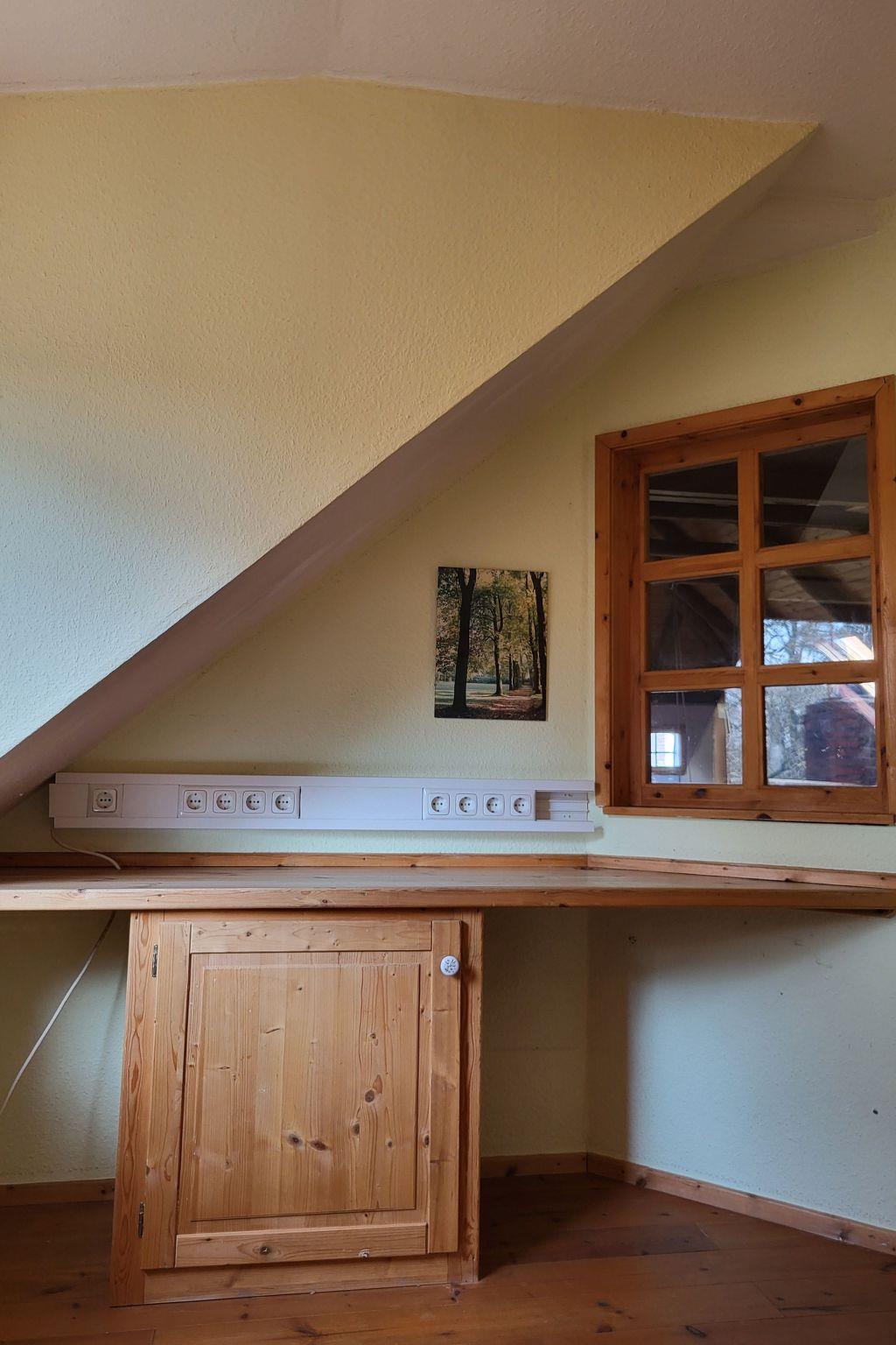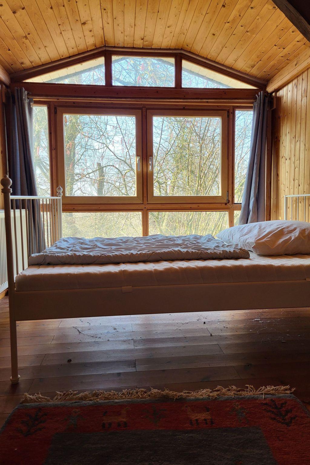 A beautiful, bright flat on the first floor of the main house with views of the surrounding greenery. An internal staircase leads to the large studio room. The 60 m2 studio flat has beds for 6 people in 4 small separate bedrooms (2x double bed, 2x alcove), a fully equipped small kitchenette (without dishwasher) and a large living room with dining area and relaxation corner including fireplace. It has a spacious bathroom with shower and fast fibre-optic WLAN access. For families, we can provide a cot and high chair on request. Our younger guests can also use the children's play equipment in the barn.