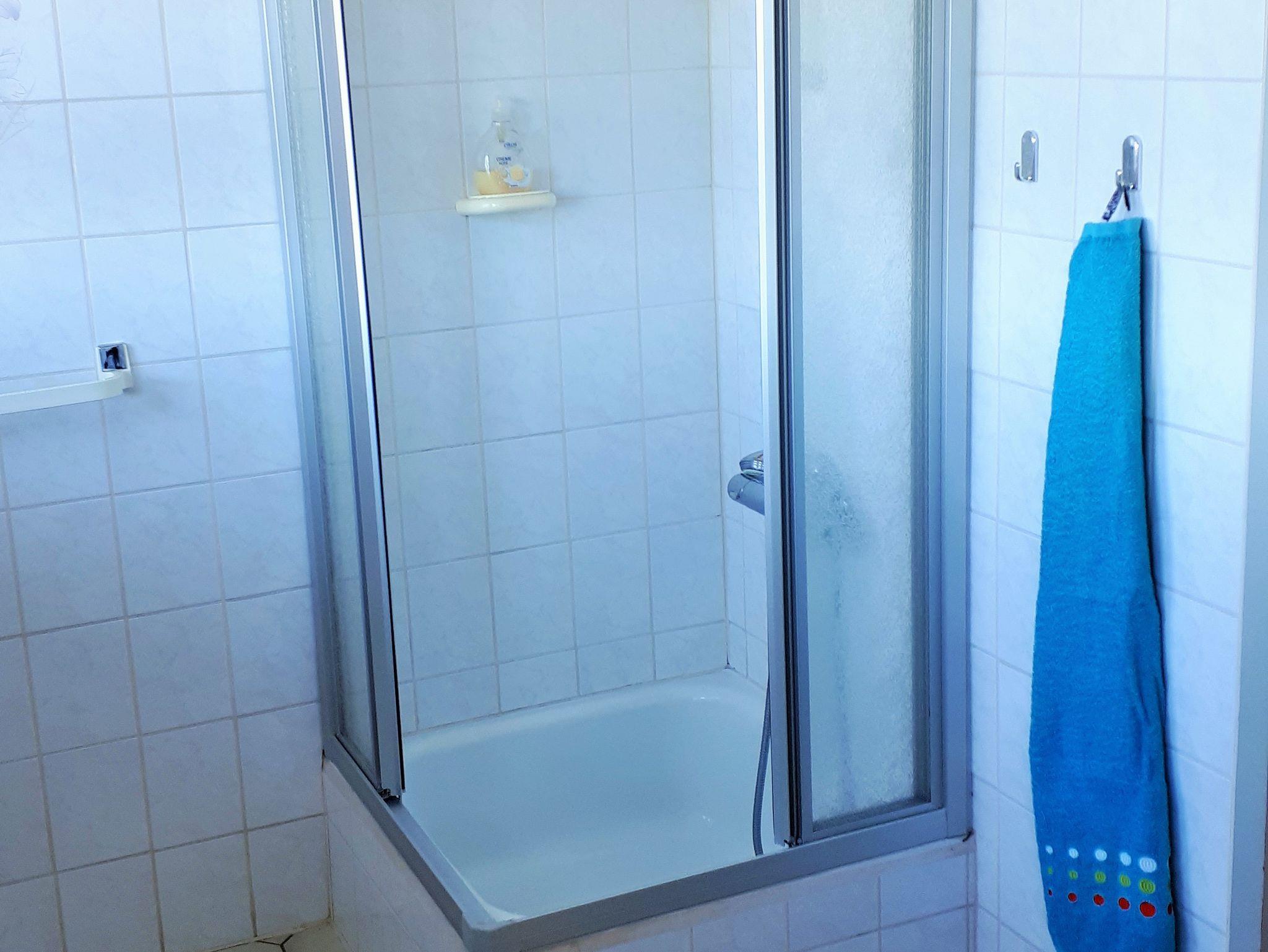 Das moderne Bad verfügt über eine Dusche mit Einstieg, ein Waschbecken mit Spiegelschrank, einen Handtuchhalter und einen Hochschrank mit Toilettenpapier.